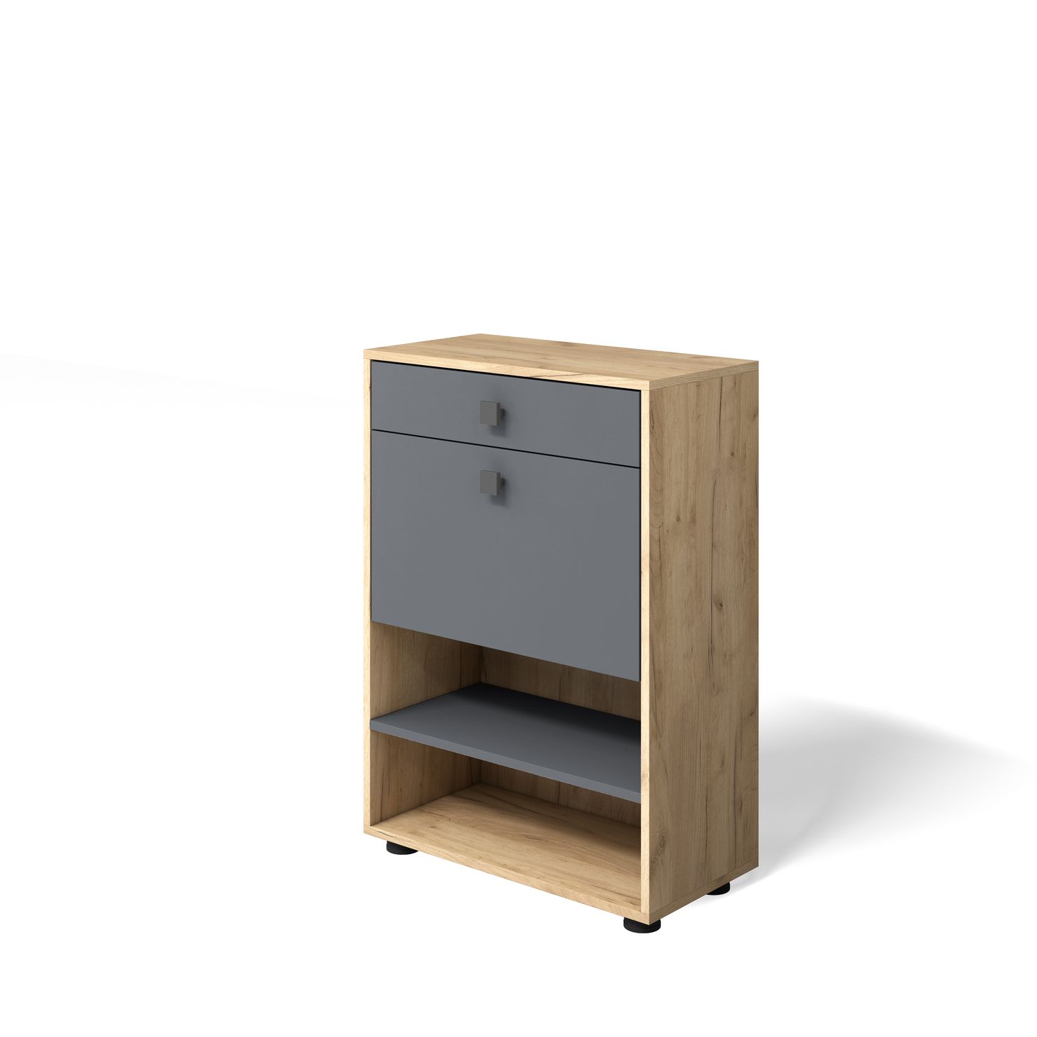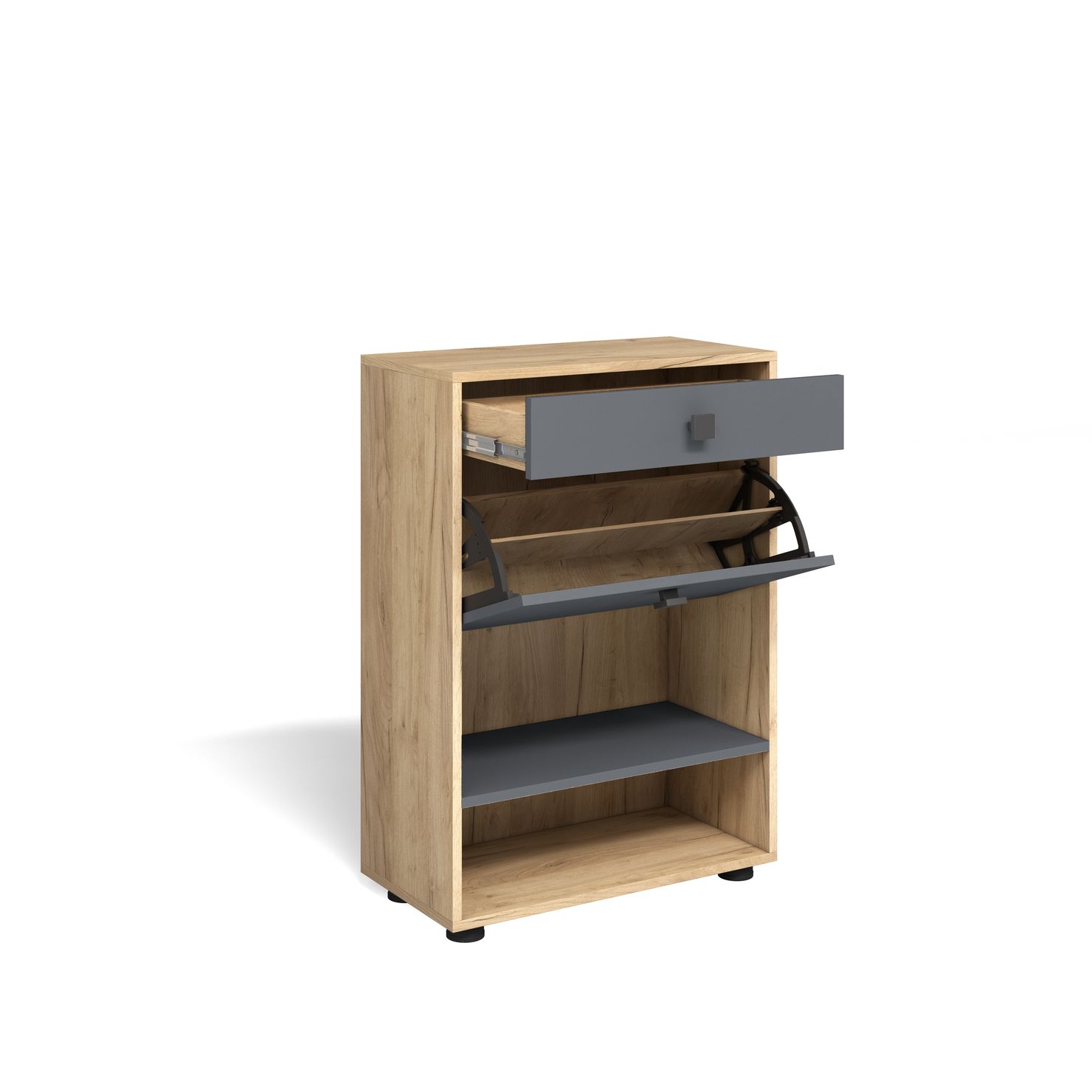 Обувница имеет ящик для мелочей, обувницу с откидной дверцей и две открытые полки для обуви.