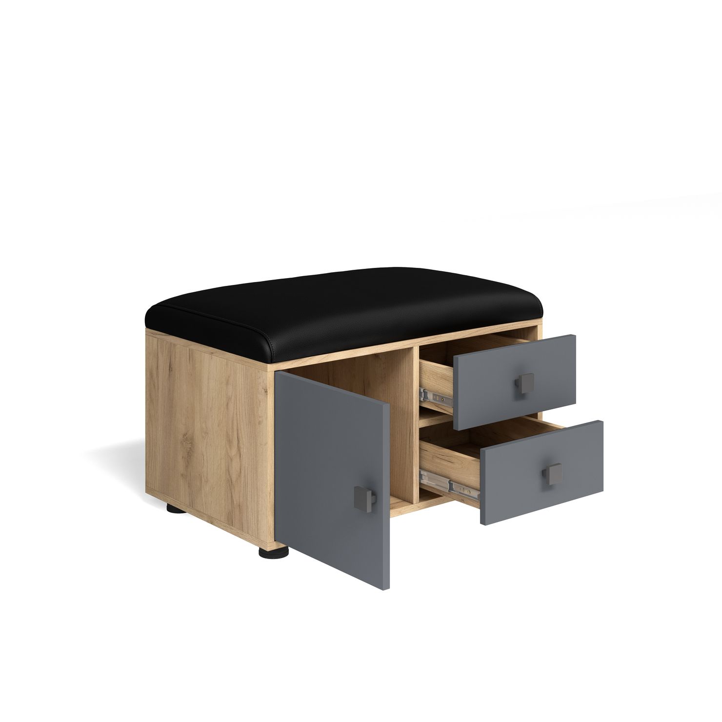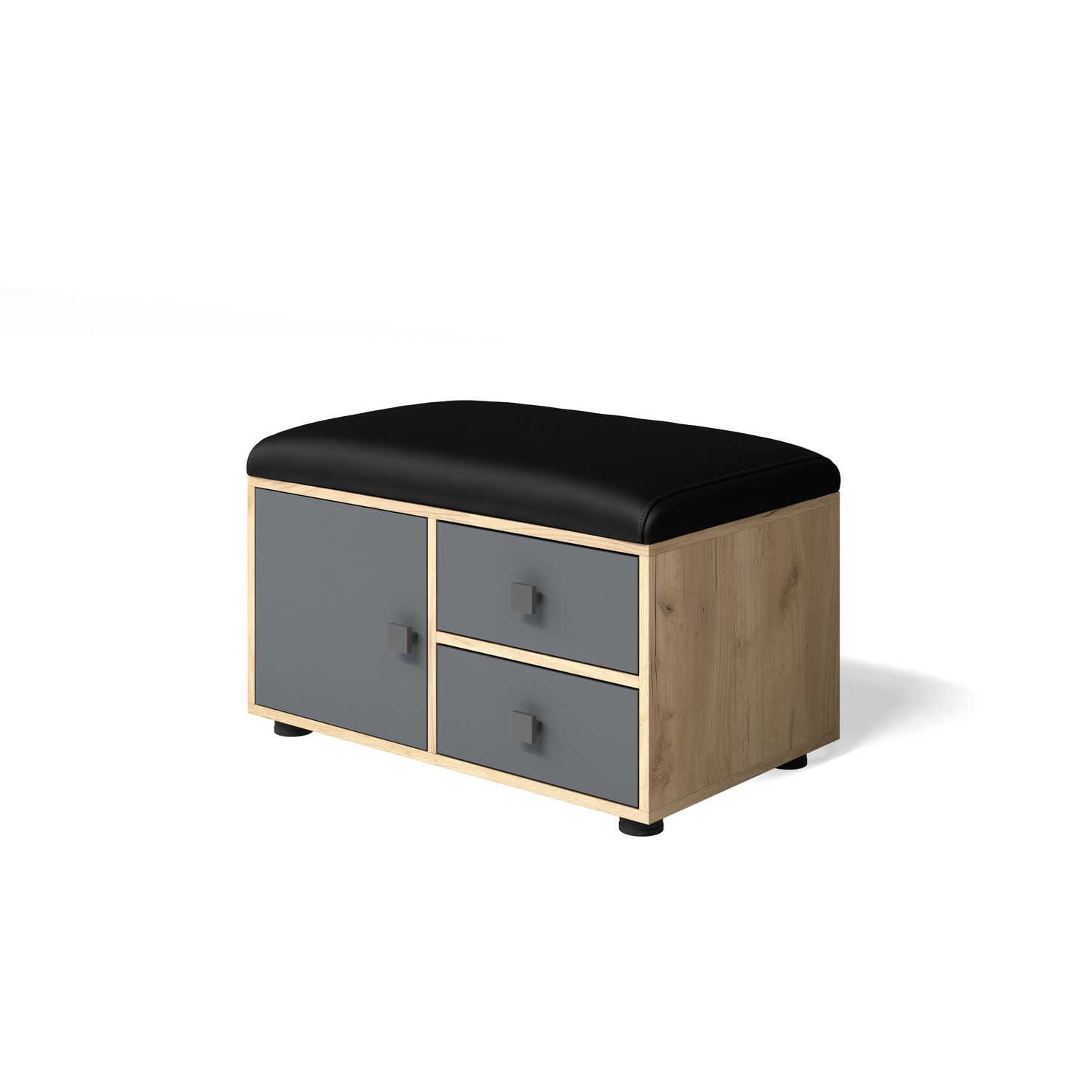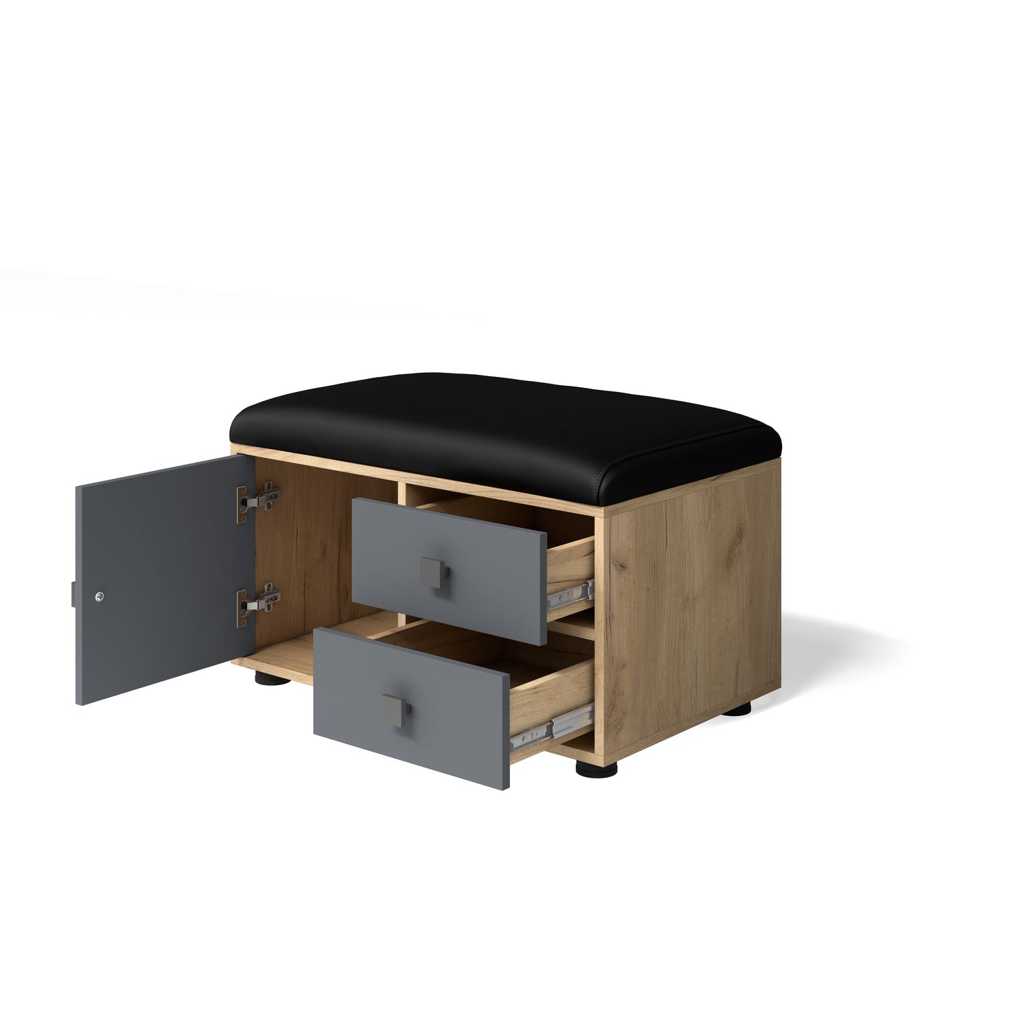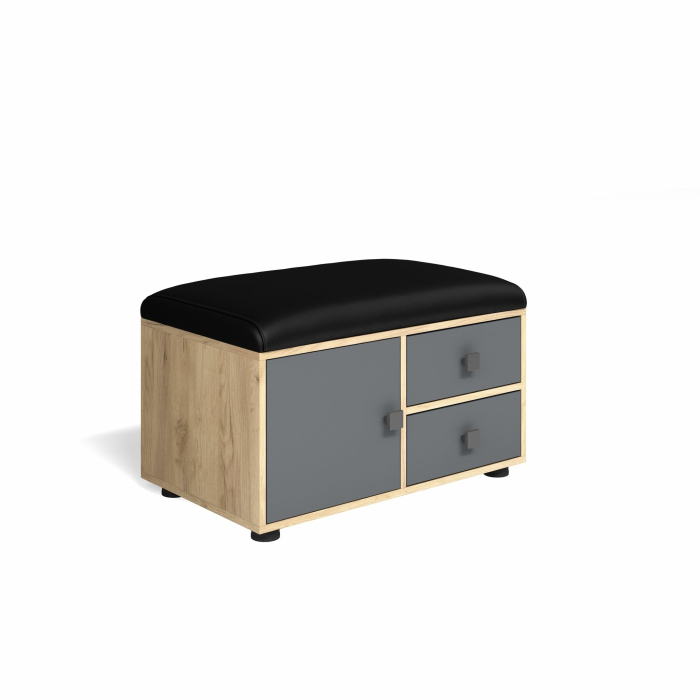 В обувнице расположена тумбочка с дверкой и два выдвижных ящика.