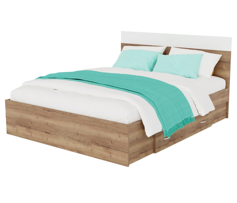 Изголовье кровати выполнено с сочетанием двух текстур ЛДСП – “дуб золотой” и “белый”. Кровать имеет усиленное металлическое основание с амортизирующими ортопедическими ламелями. Нагрузка на одно спальное место 125 кг. (на кроватное полотно – не более 250 кг.)