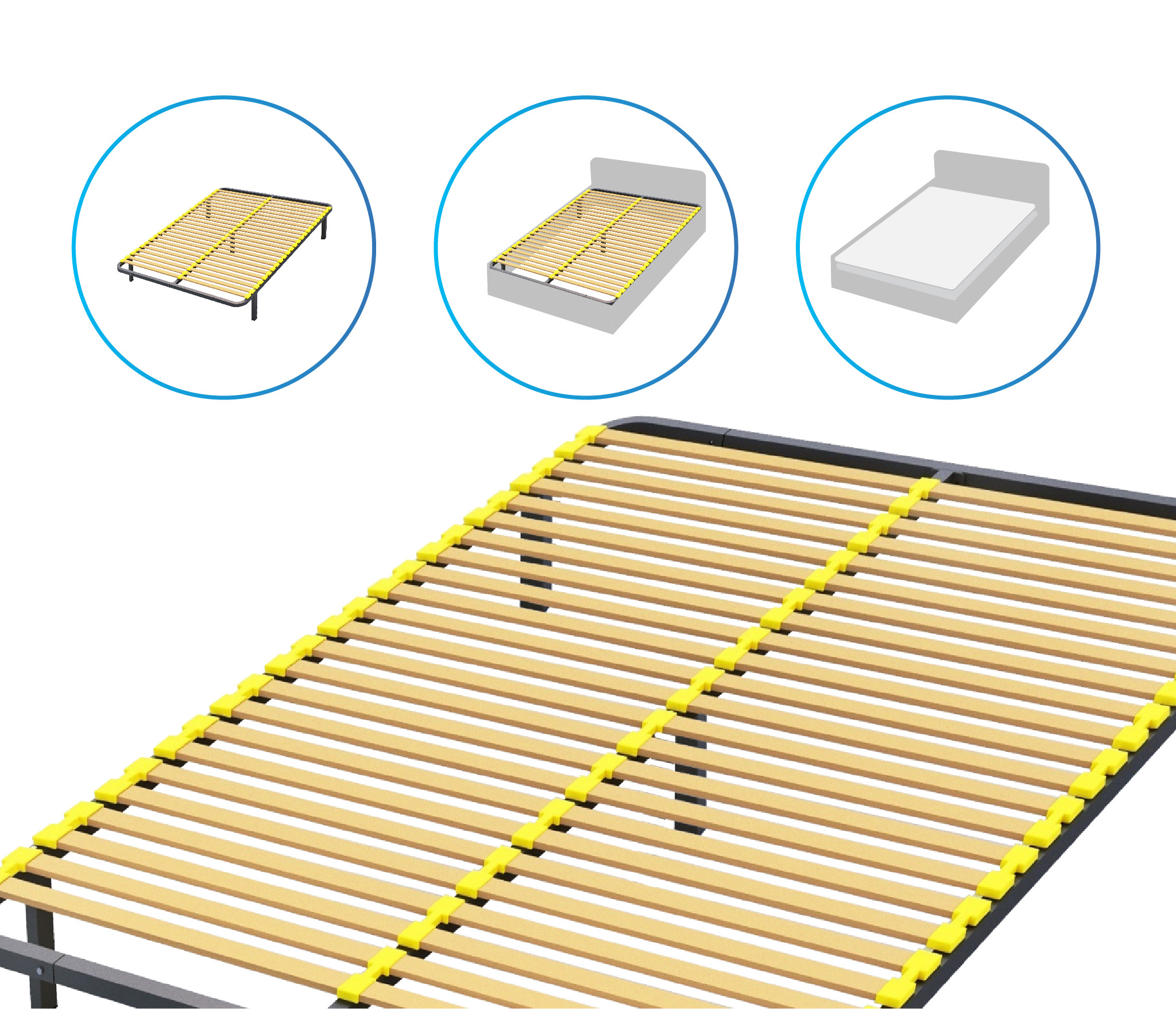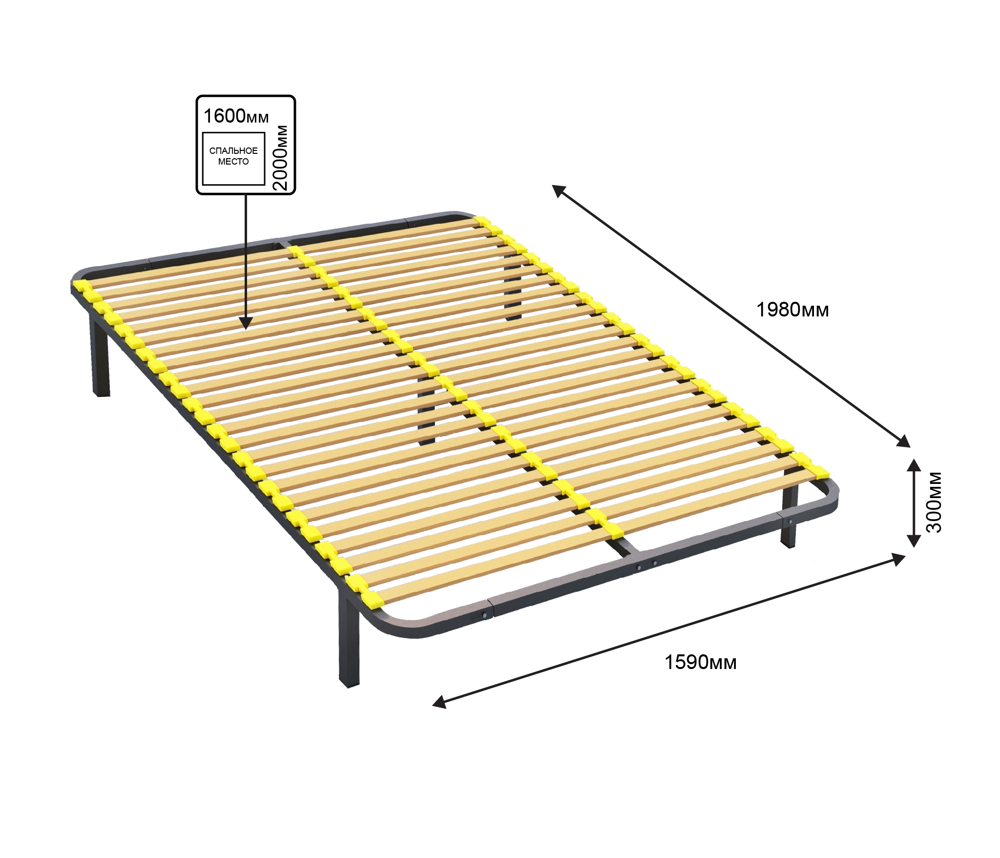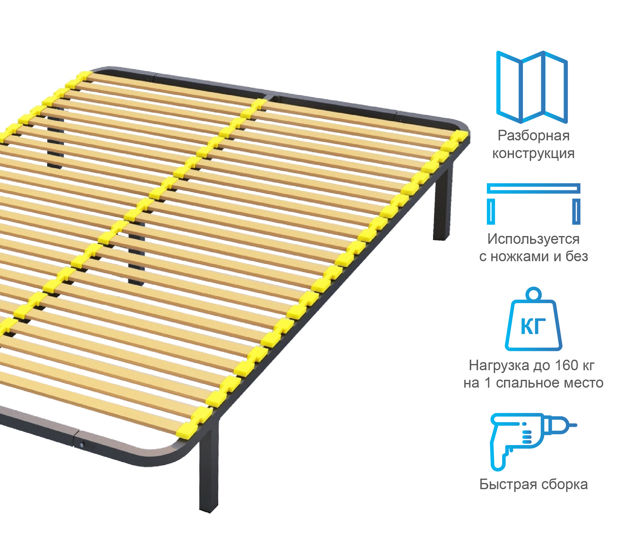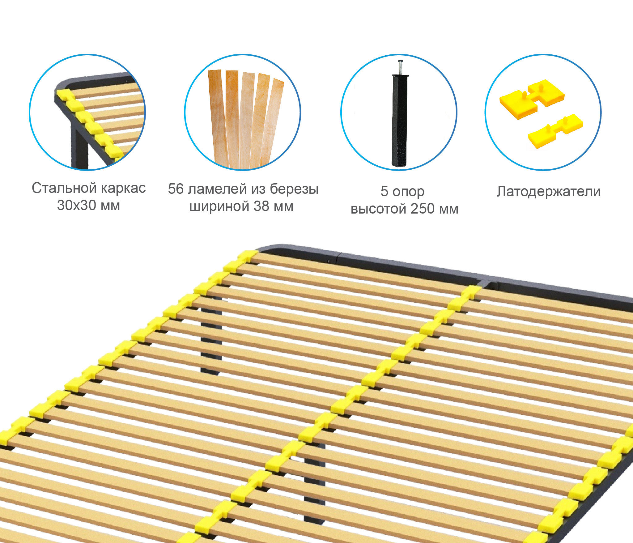 Разборное кроватное основание выполнено из металлической трубы квадратного сечения (30х30мм) и упругих гнуто-клееных берёзовых ламелей шириной 38 мм, толщиной 8 мм.