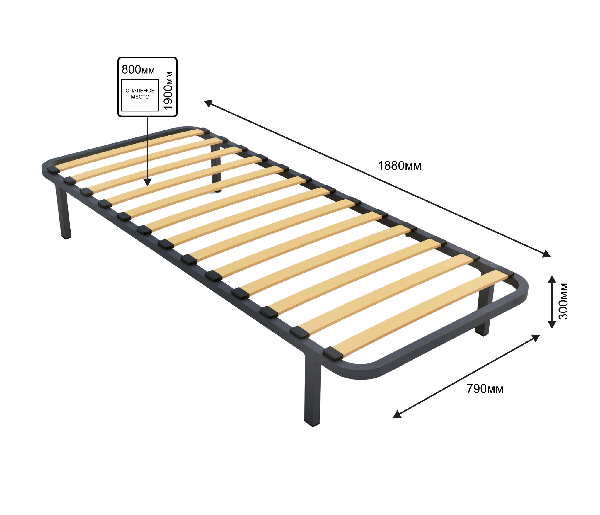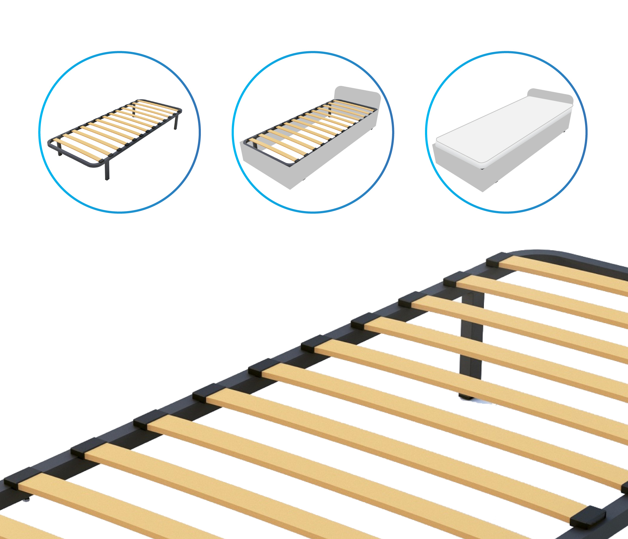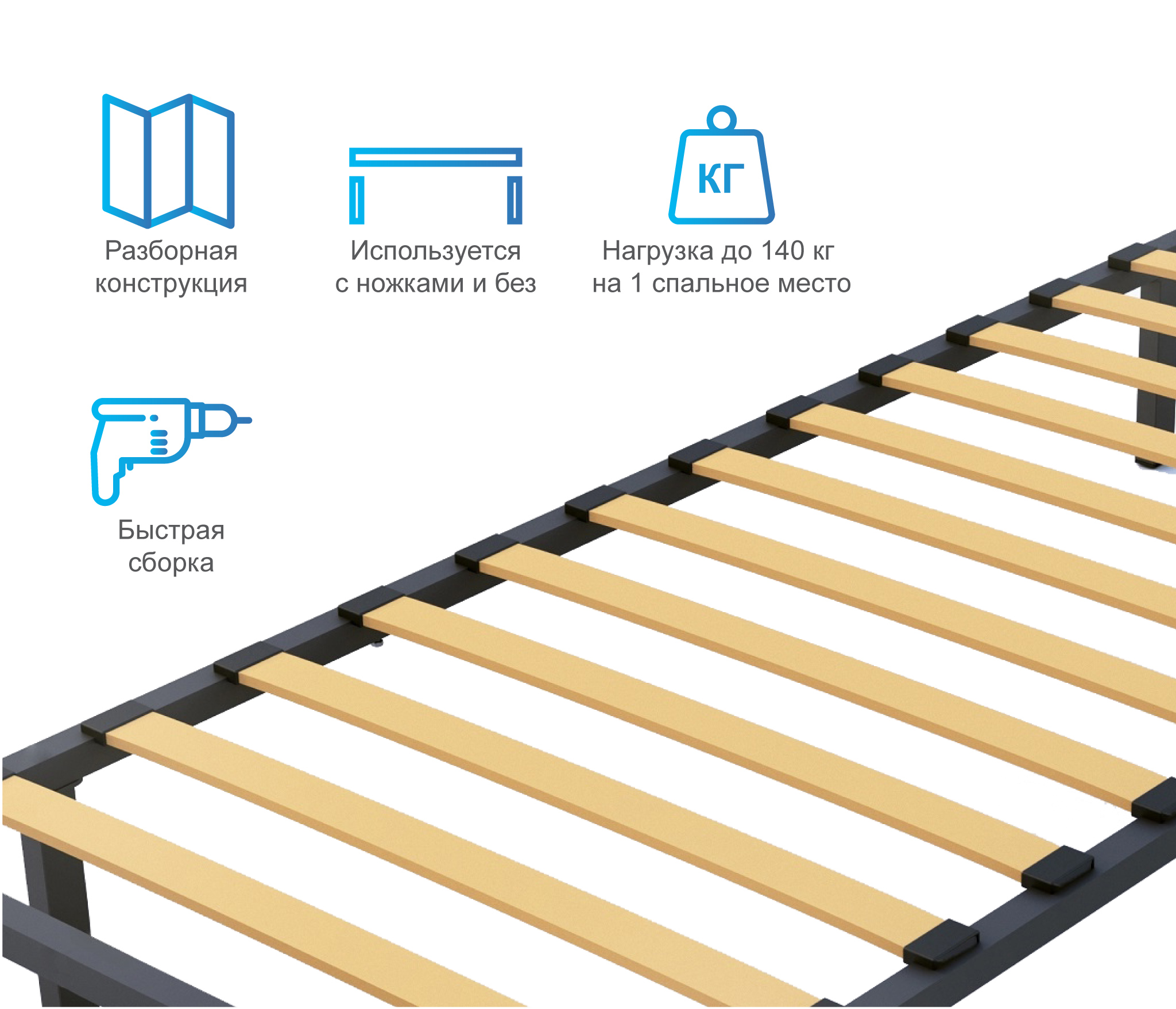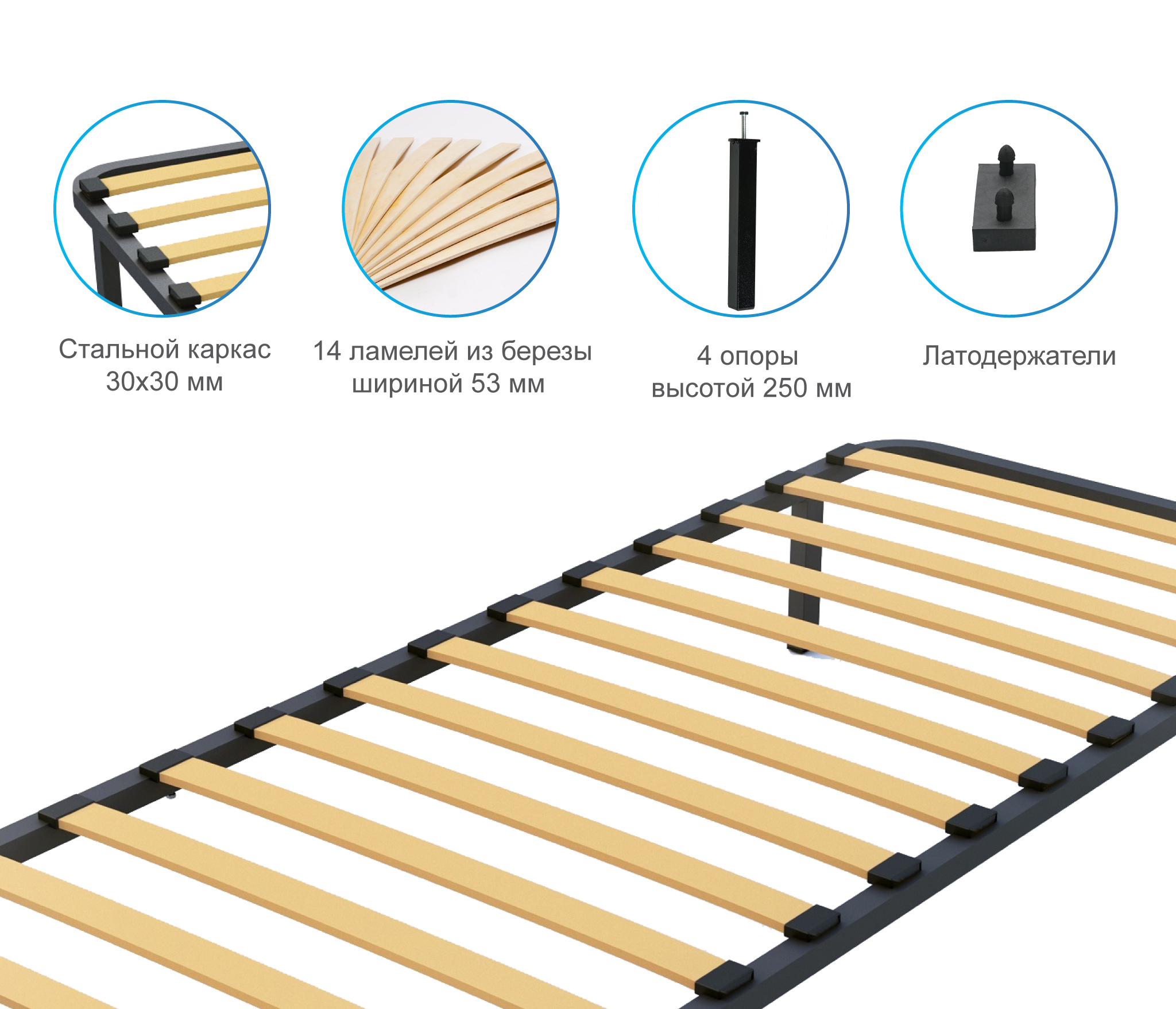 Разборное кроватное основание выполнено из металлической трубы квадратного сечения (30х30мм) и упругих гнуто-клееных берёзовых ламелей шириной 53 мм, толщиной 8 мм.
