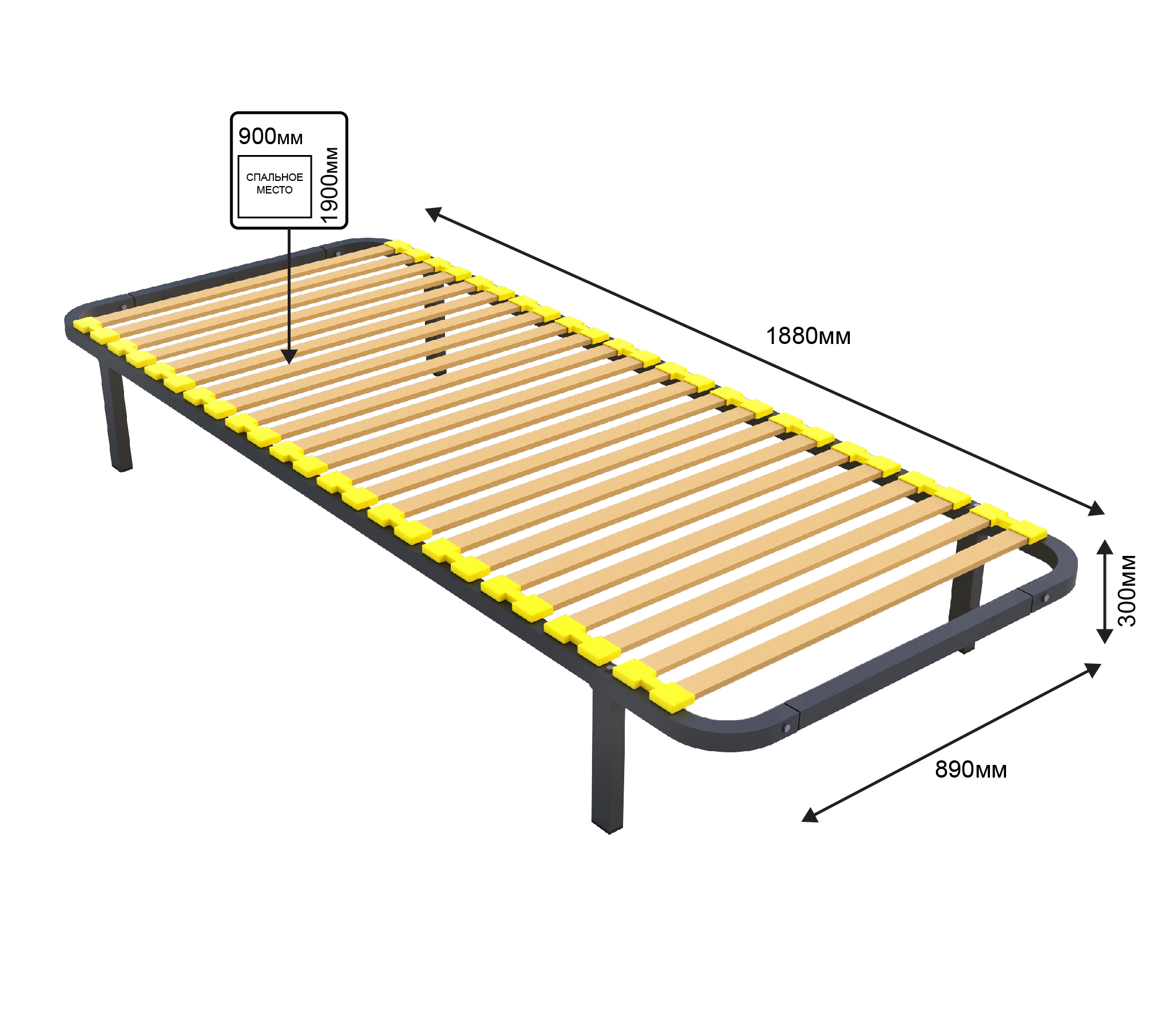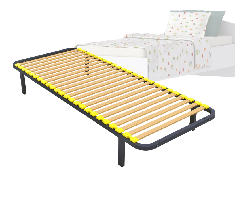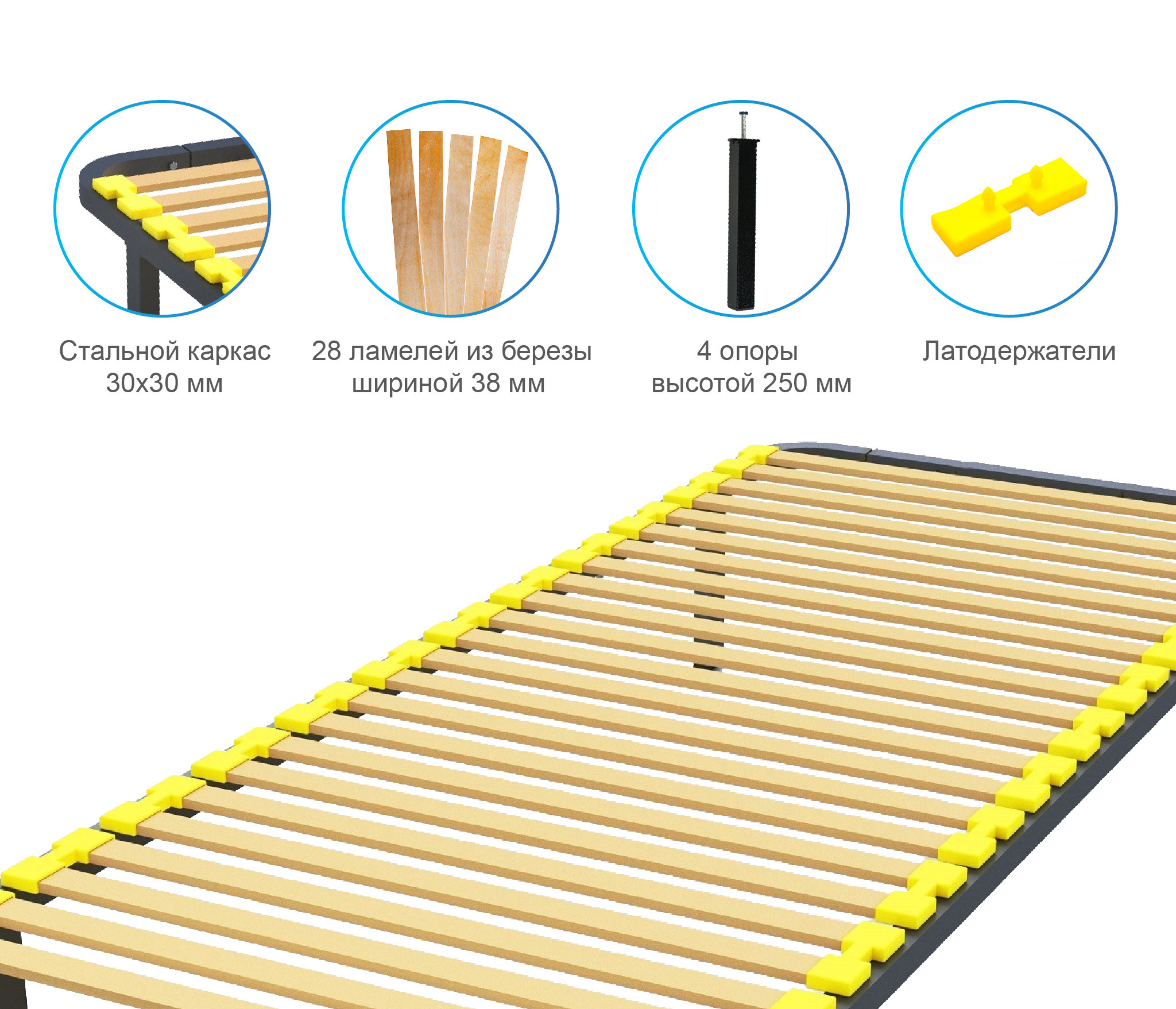 Разборное кроватное основание выполнено из металлической трубы квадратного сечения (30х30мм) и упругих гнуто-клееных берёзовых ламелей шириной 38 мм, толщиной 8 мм.