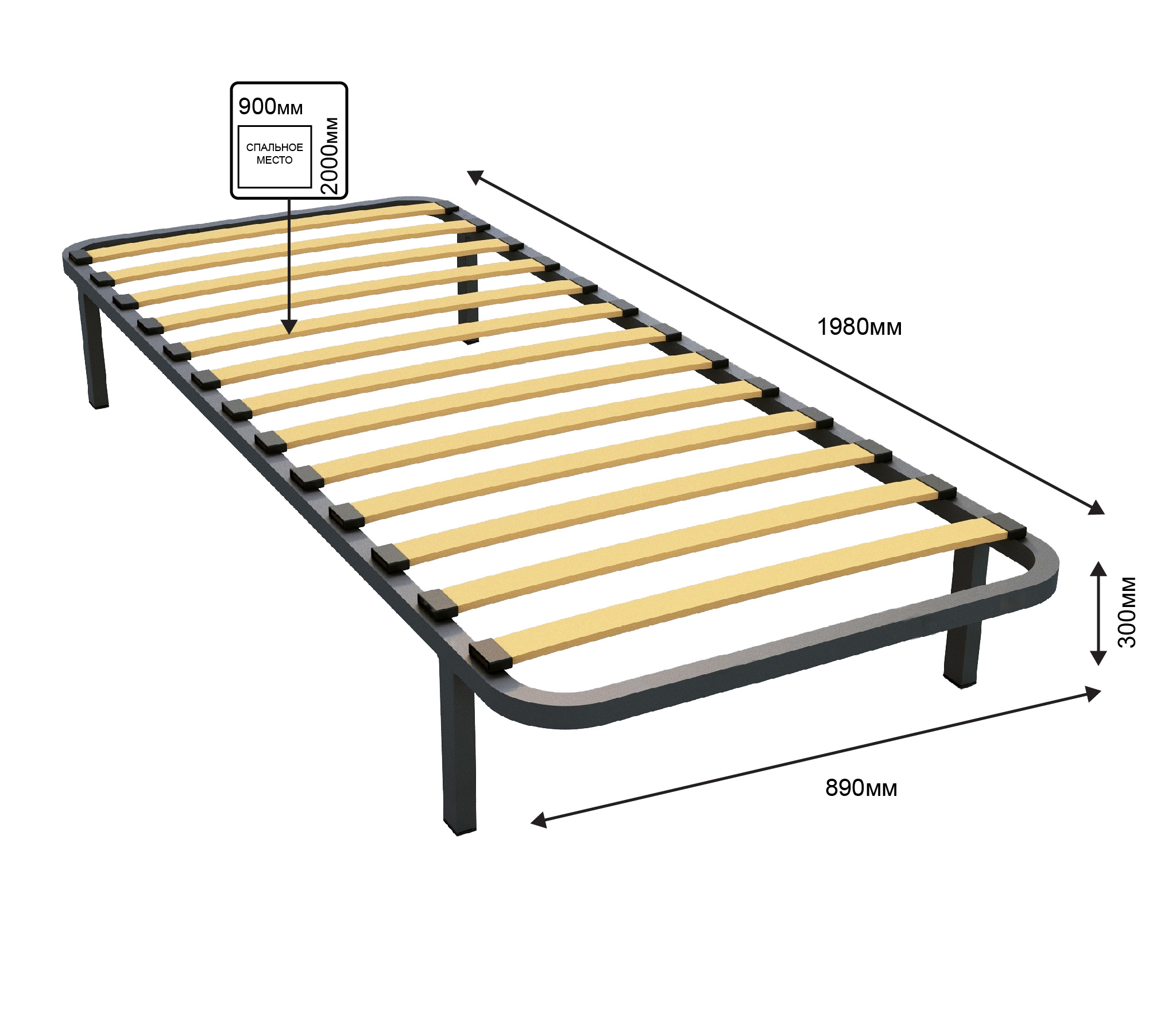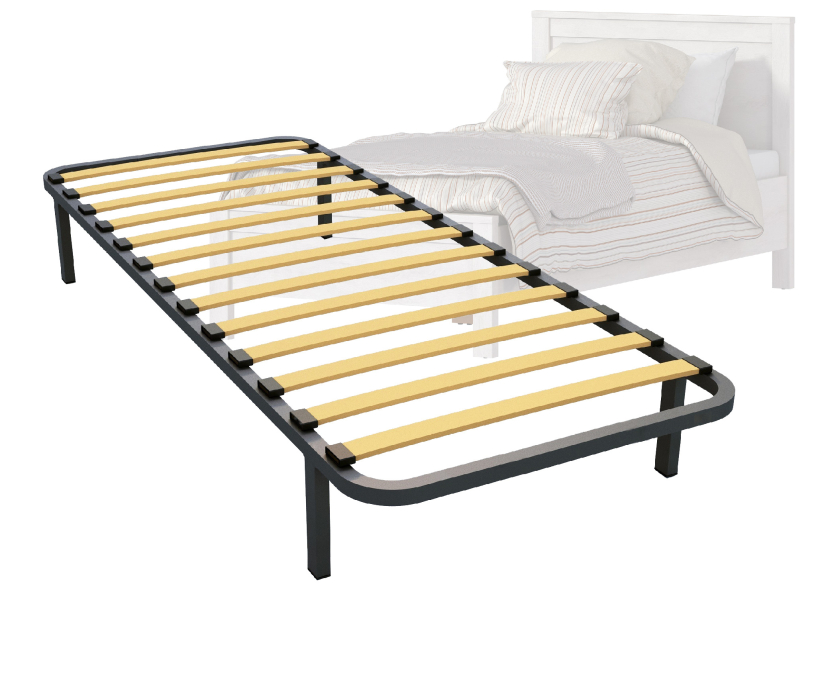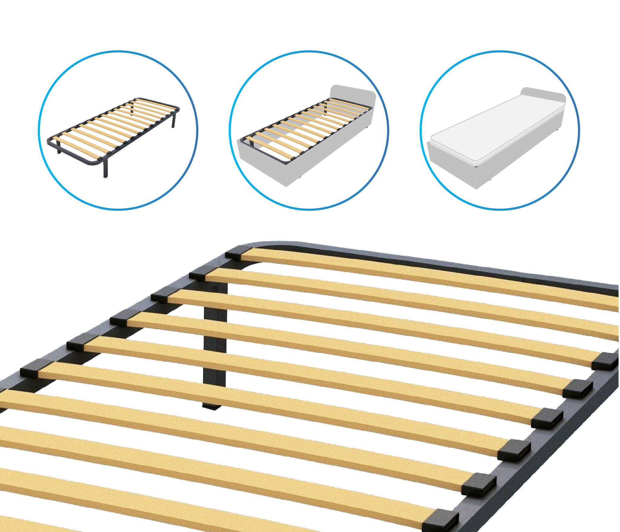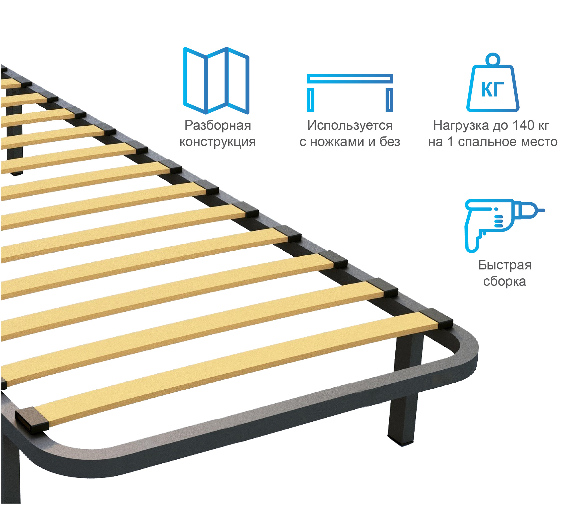 Разборное кроватное основание выполнено из металлической трубы квадратного сечения (30х30мм) и упругих гнуто-клееных берёзовых ламелей шириной 53 мм, толщиной 8 мм.