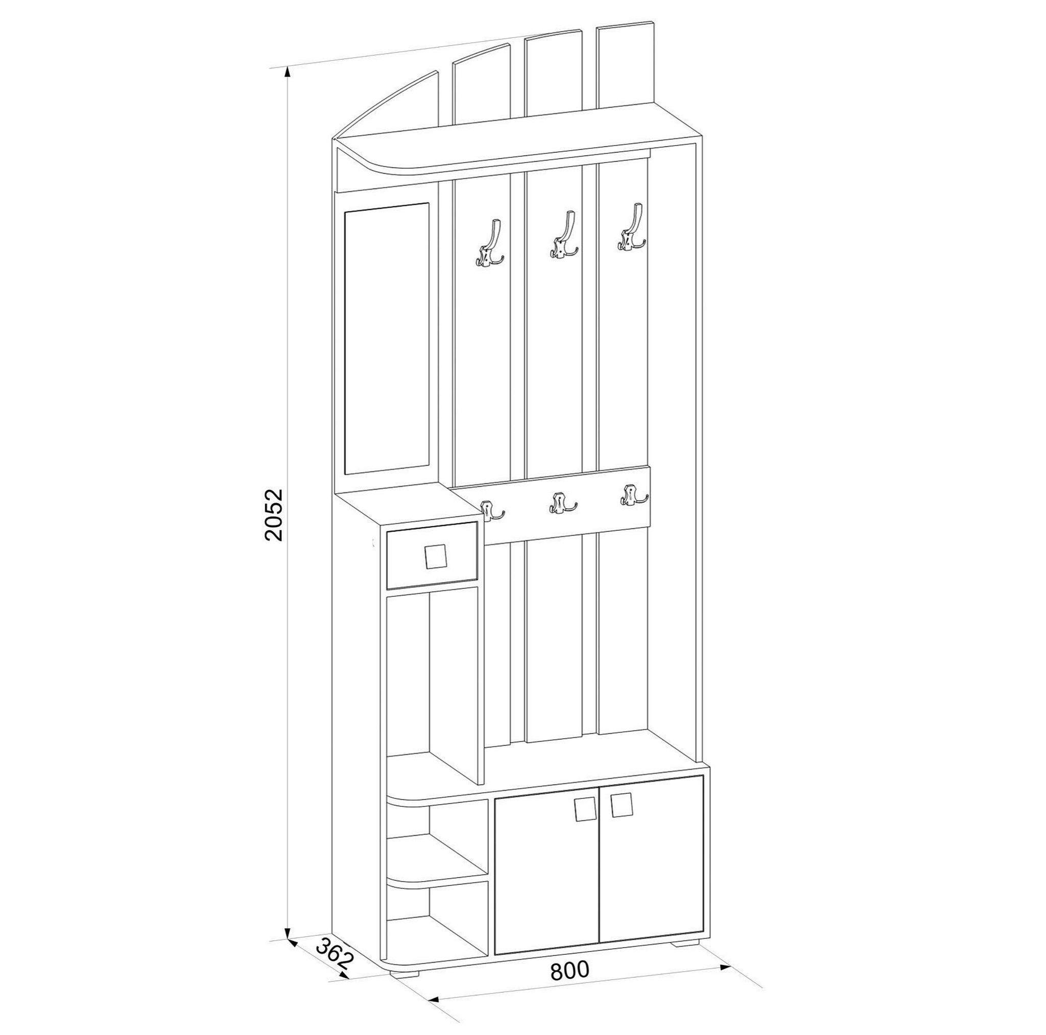 Прихожая Винс - это полноценная и современная прихожая для Вашего дома. В ее составе есть все необходимое для комфортного размещения одежды: это открытая вешалка с крючками для верхней одежды и сумок, большое зеркало, под которым есть ящик для мелочей, есть три открытые полки, на которых можно разместить обувь, в верхней части расположена полка для головных уборов, а внизу тумба для обуви, оборудованная сиденьем. Прихожая идеально подходит для любого помещения. Прихожая Винс будет содержать Ваши вещи в порядке и радовать Вас долгое время.