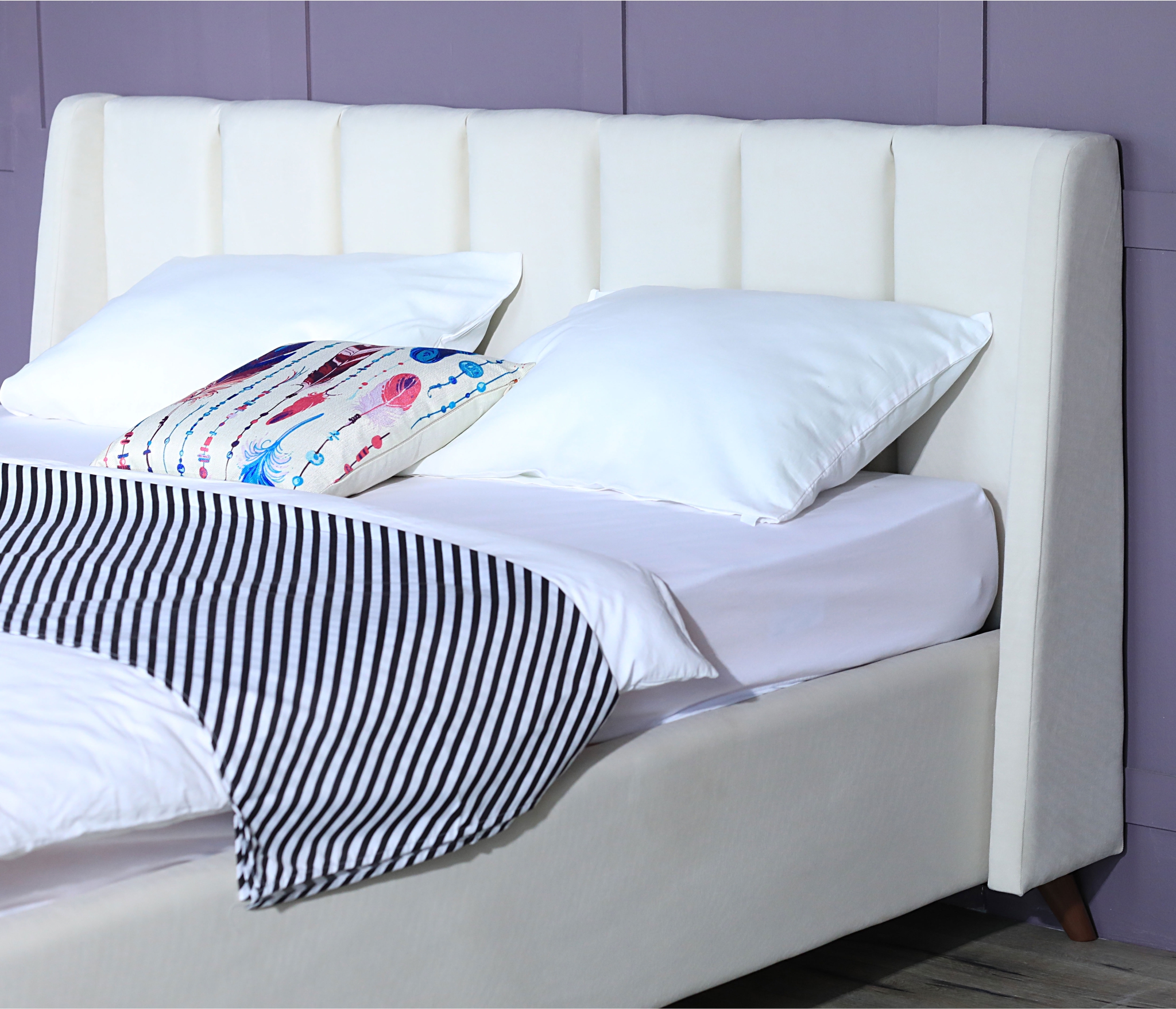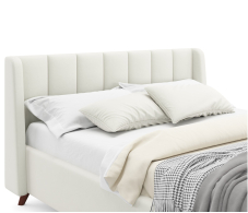 Основной акцент сделан на высоком изголовье с декоративной прострочкой и мягкими боковинами – “ушками”. Мягкие боковины не только придают королевский вид данной двуспальной кровати, но и позволяют использовать ее для отдыха. На пышное изголовье приятно облокотиться за чтением любимой книги или во время просмотра телепередачи.