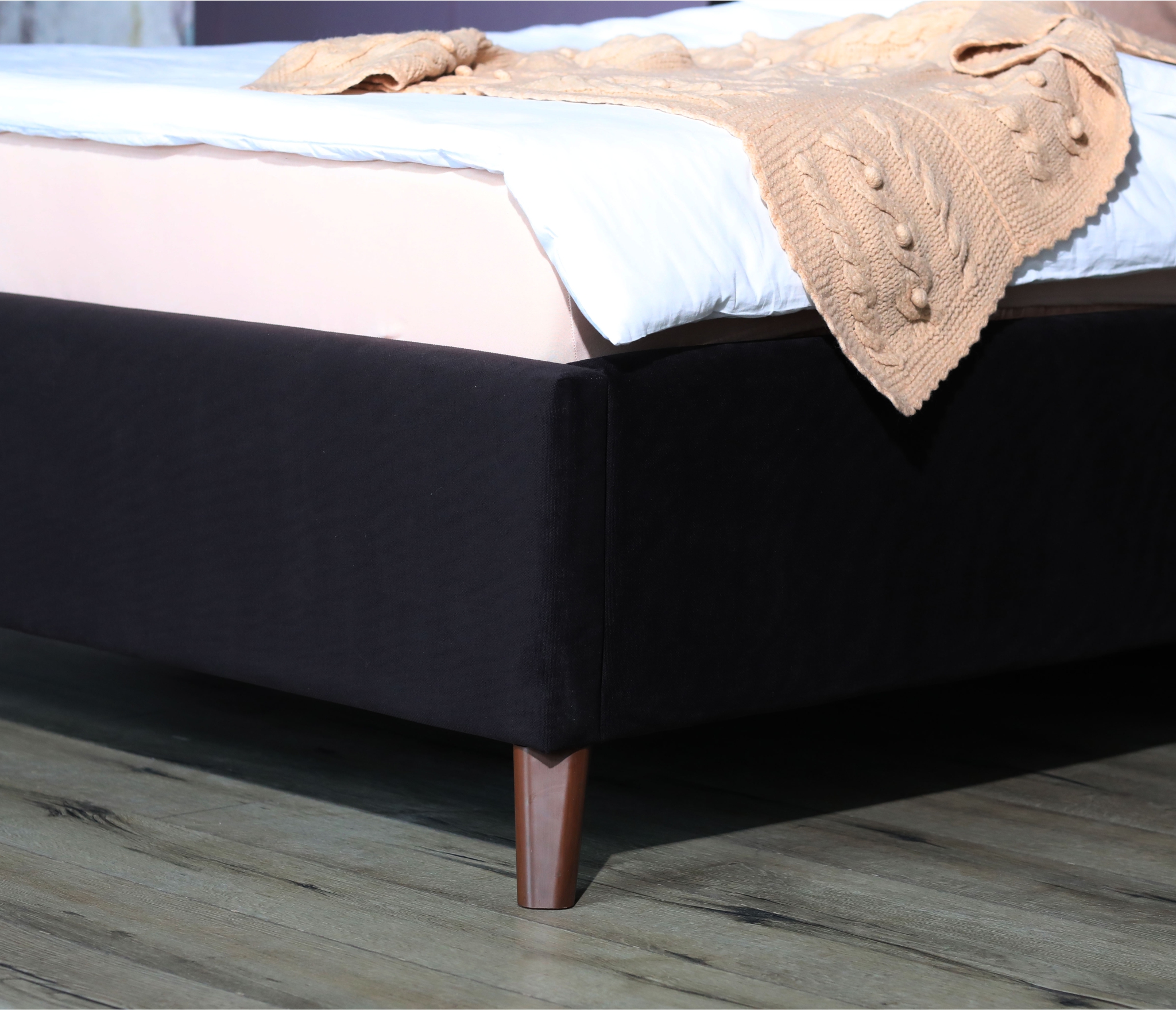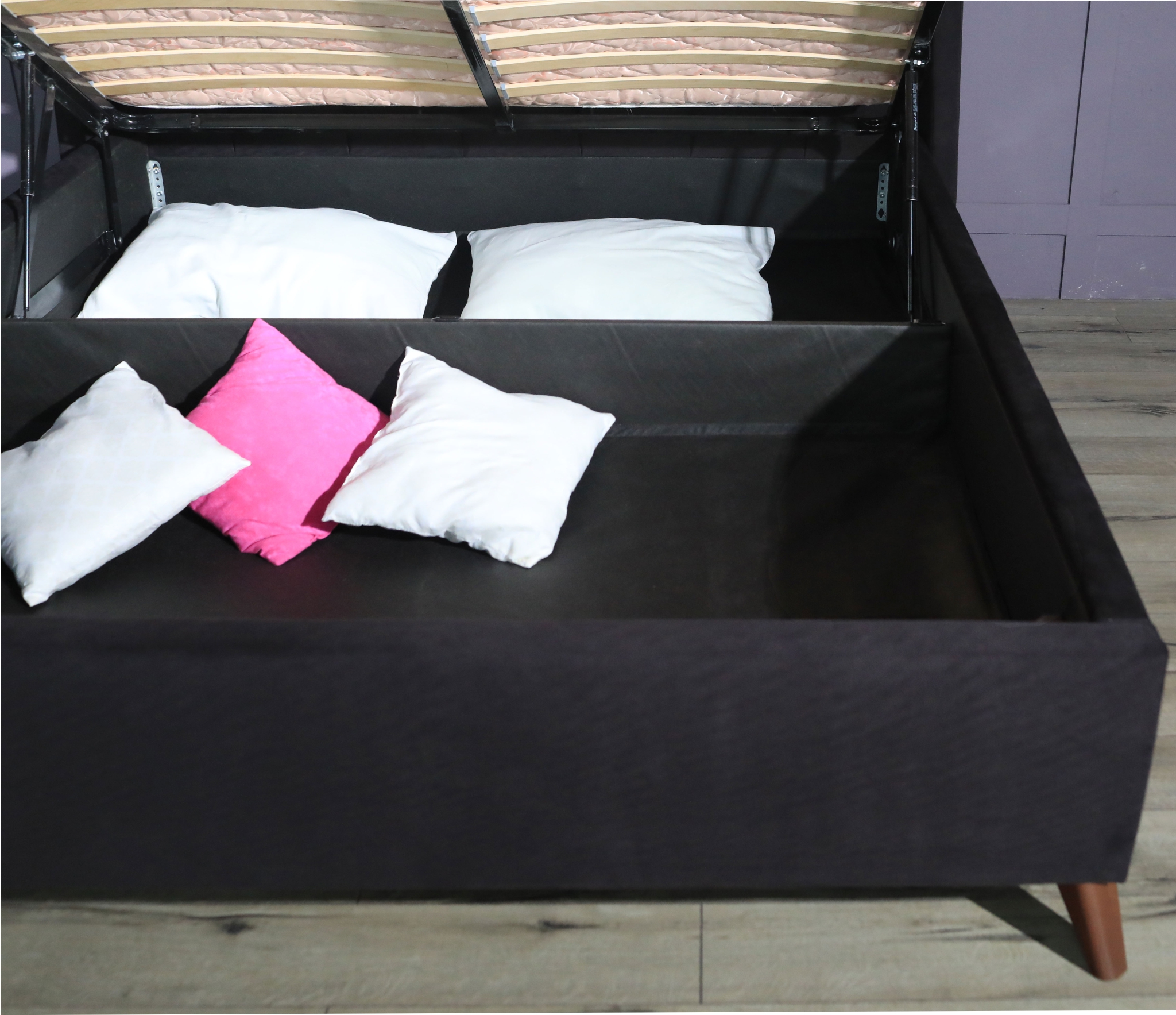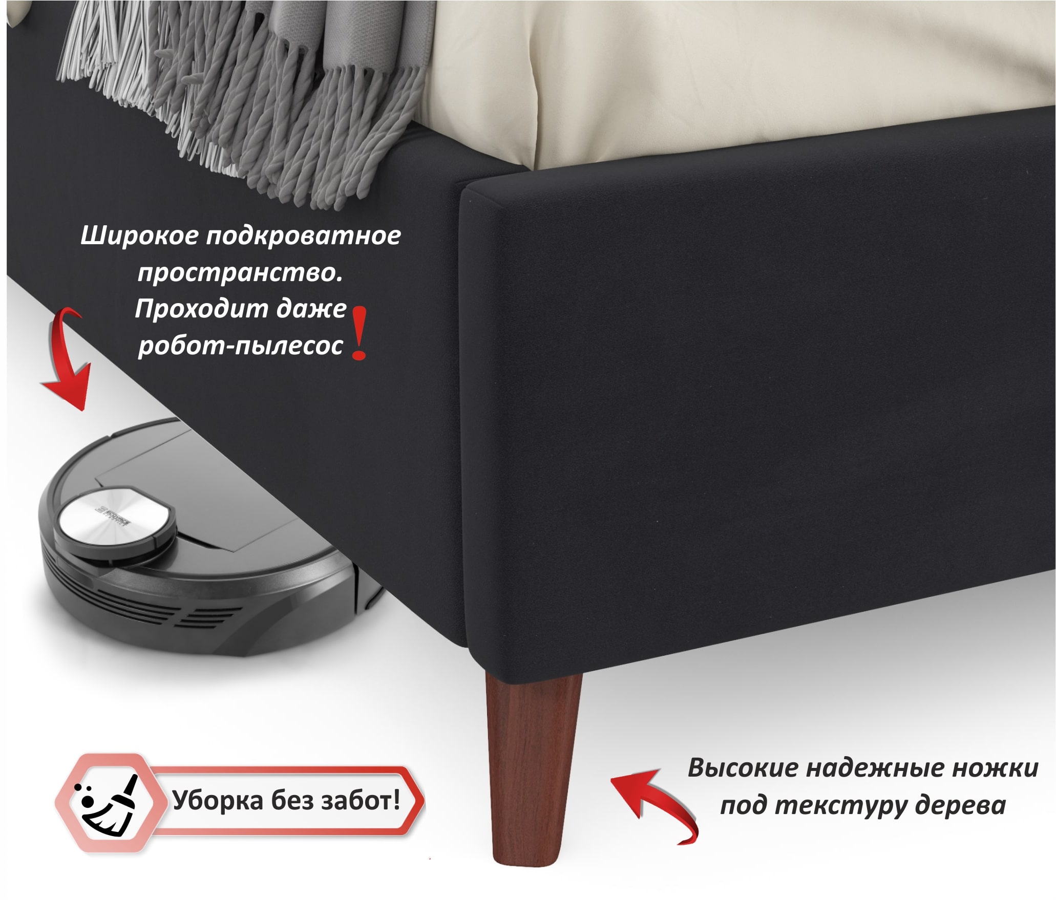 Мягкая кровать на ножках – это надежный устойчивый предмет мебели. Ножки придают кровати изящество и грацию. Подкроватное пространство легко убирать не только вручную, но и с помощью современных технологий – робота-пылесоса, который легко проходит под спальным местом.