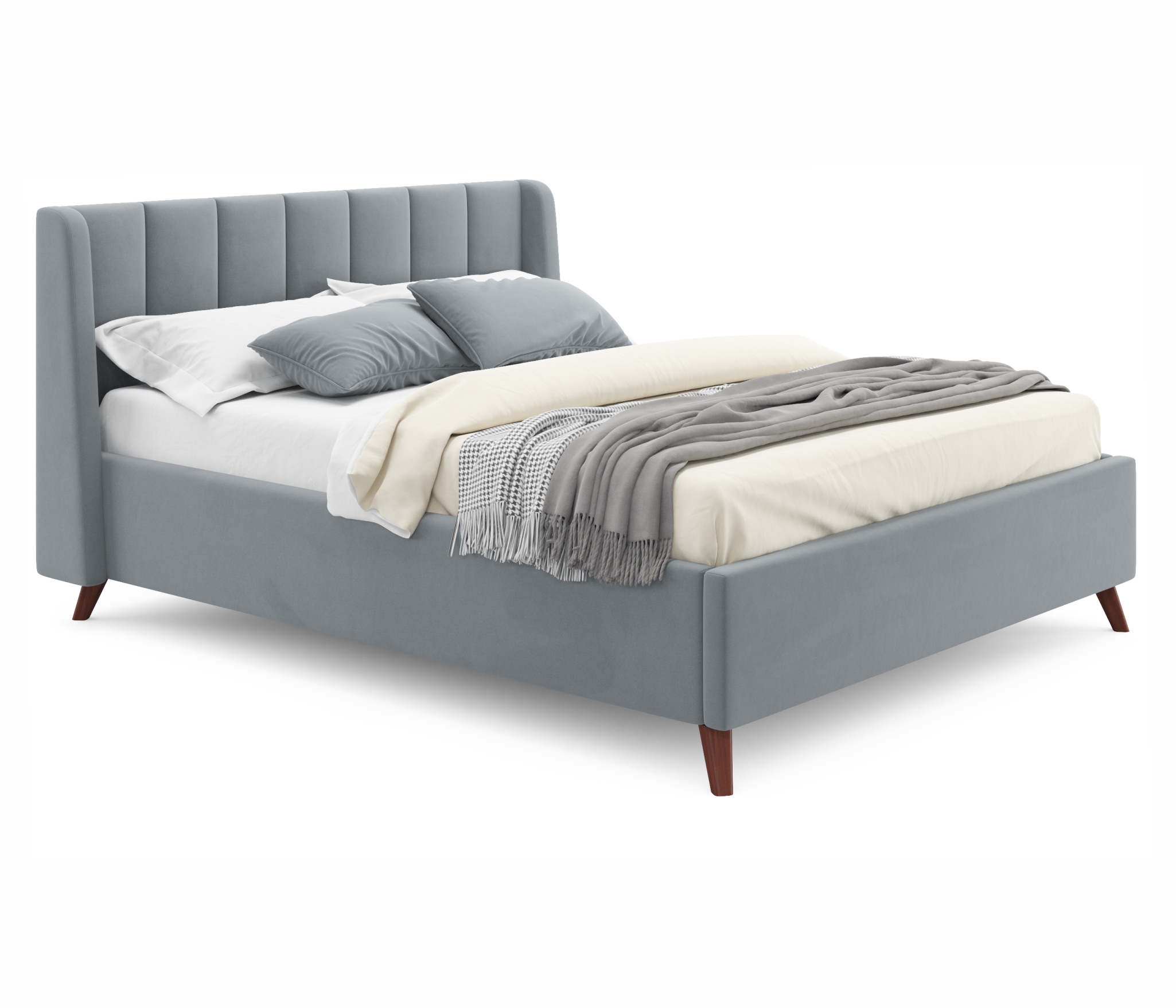 Мягкая интерьерная кровать на ножках Betsi (Бетси) 1600 с подъемным механизмом и матрасом. Кровать имеет рельефную мягкую спинку с неглубокими стяжками. Обивка изголовья и весь периметр кровати выполнен из мебельной ткани – велюр. Ткань износостойкая, легко чистится от загрязнений.