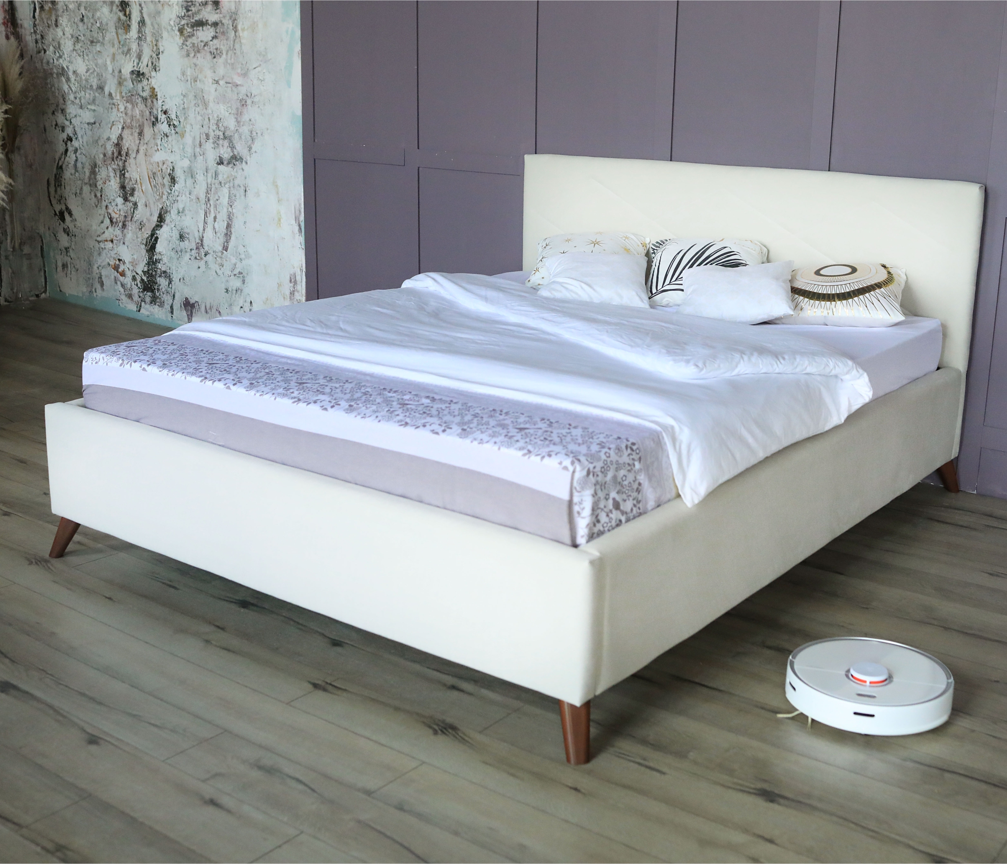 Мягкая кровать на ножках – это надежный устойчивый предмет мебели. Ножки придают кровати изящество и грацию. Подкроватное пространство легко убирать не только вручную, но и с помощью современных технологий – робота-пылесоса, который легко проходит под спальным местом.