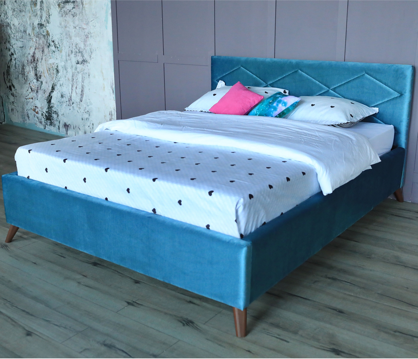 Кровать имеет рельефную мягкую спинку, декорированную прострочкой в виде ромбов, которые украшают изголовье кровати. Обивка мягкого изголовья и весь периметр кровати выполнен из мебельной ткани – велюр. Это уникальный материал, который получается за счет сплетения пяти волокон одновременно. Дорогая ткань велюр придает кровати более величественный благородный вид. Ткань износостойкая, легко чиститься от загрязнений (влажной тряпочкой, любыми средствами, кроме средств с растворителями), практичная, эластичная, устойчивая к ультрафиолету.