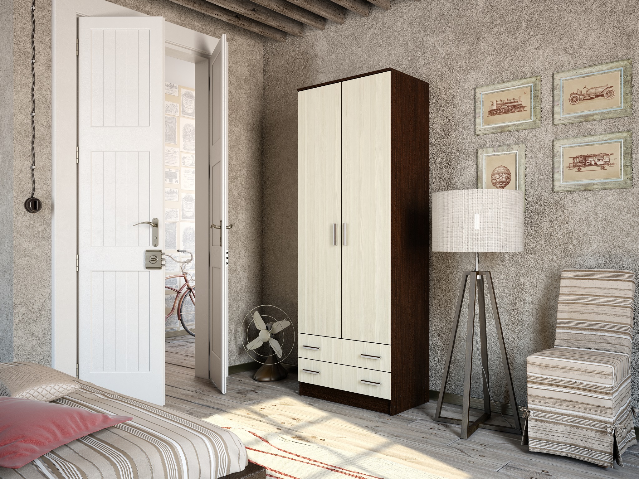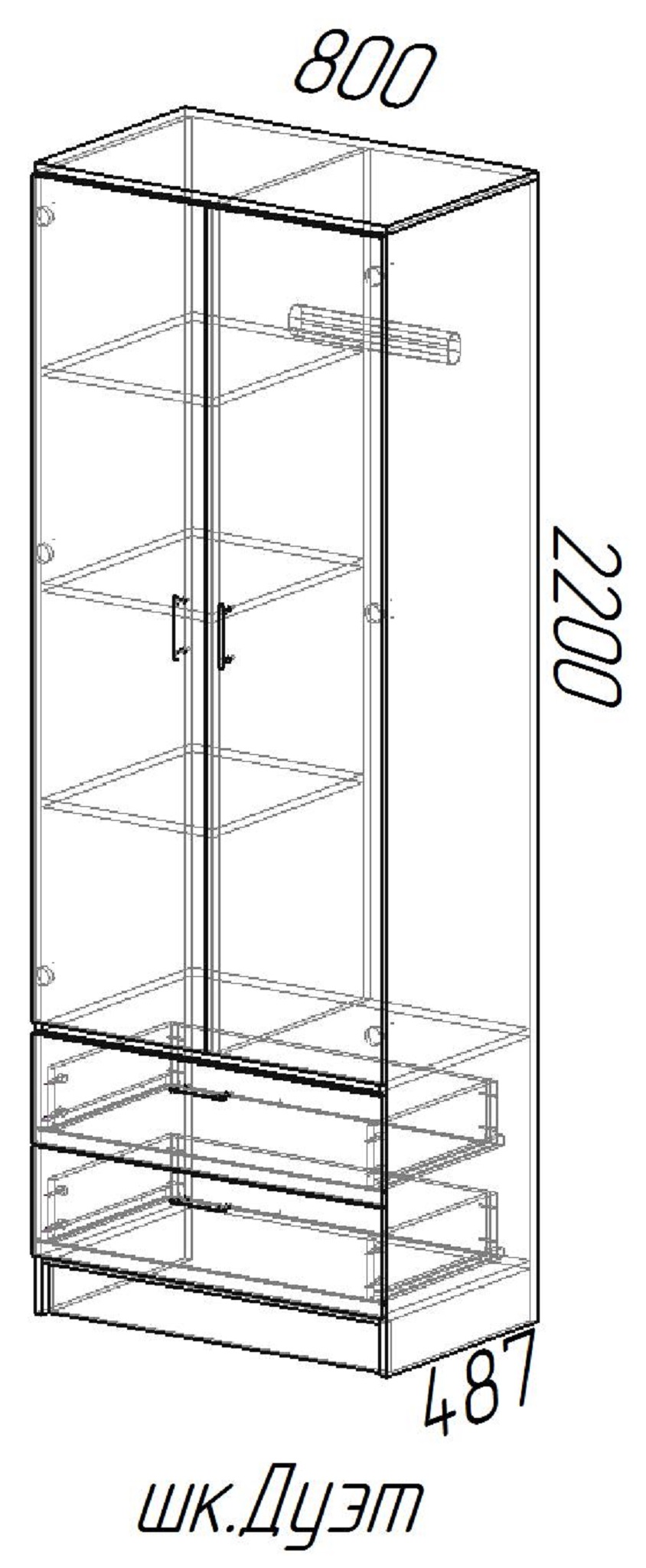 Эргономичное наполнение шкафа Дуэт: три полки, штанга, два выдвижных ящика, поможет удобно разместить ваши вещи в одном месте.