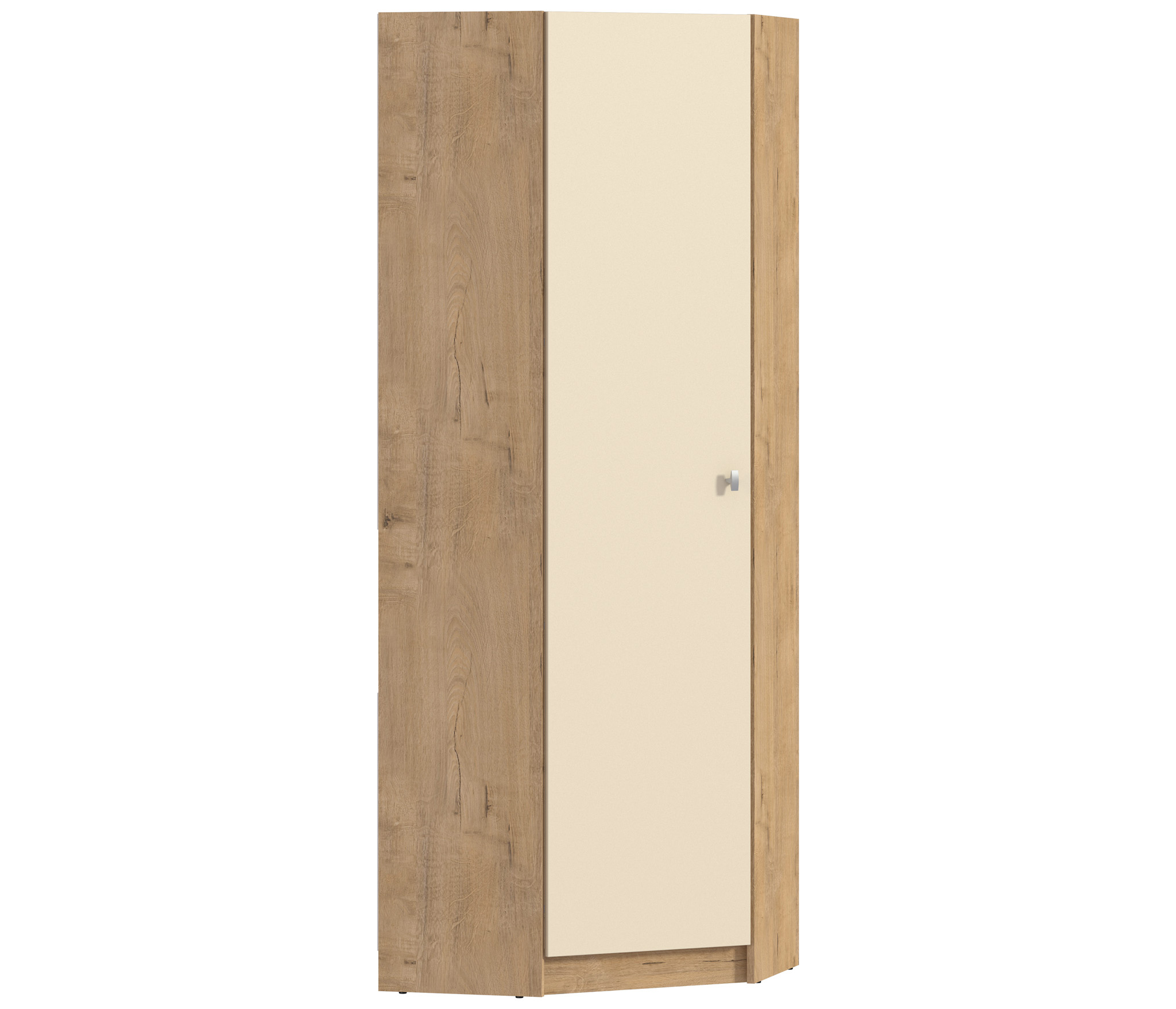 Выполнен шкаф из современного и прочного материала. Цвет отделки корпуса – «Дуб Бунратти», фасад двери в цвете «Ваниль». Шкаф может быть дополнен элементами модульного гарнитура Сидней. Лаконичный дизайн, продуманная фурнитура, прочные крепёжные механизмы говорят о достойном качестве углового шкафа Сидней, который можно рассматривать как отдельный предмет интерьера, а можно стилизовать в гарнитур.