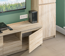 Габаритные размеры – ширина 140 см, высота 44 см и глубина 44 см. Вес тумбы 33,92 кг, что даёт возможность передвигать её по усмотрению. Визуально тумбу можно разделить на три отделения. В центре над выдвижным ящиком расположена открытая полка. По бокам два вместительных отделения за отдельными дверцами. Отличительной особенностью тумбы является отсутствие ручек, которые интегрированы в фасады. ¶Тумба выполнена в лаконичном дизайне из экологичного современного ЛДСП. Материал отделки устойчив к влаге и воздействию бытовых чистящих средств, что актуально для светлых поверхностей.