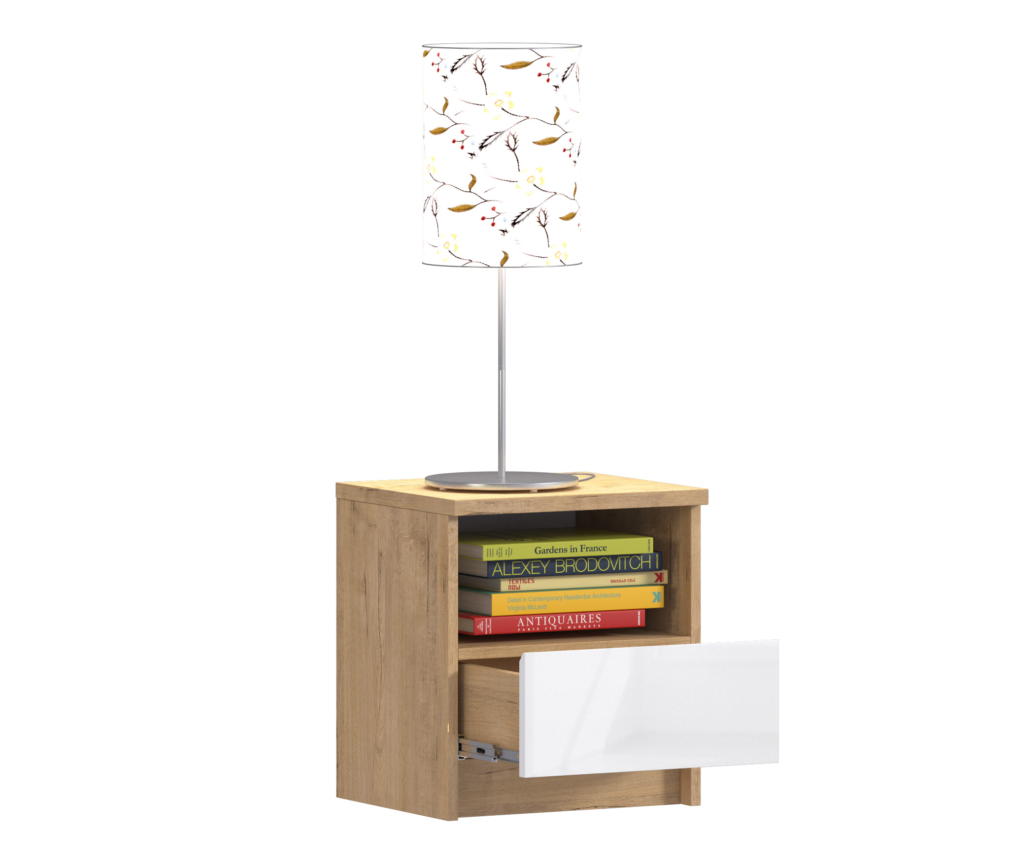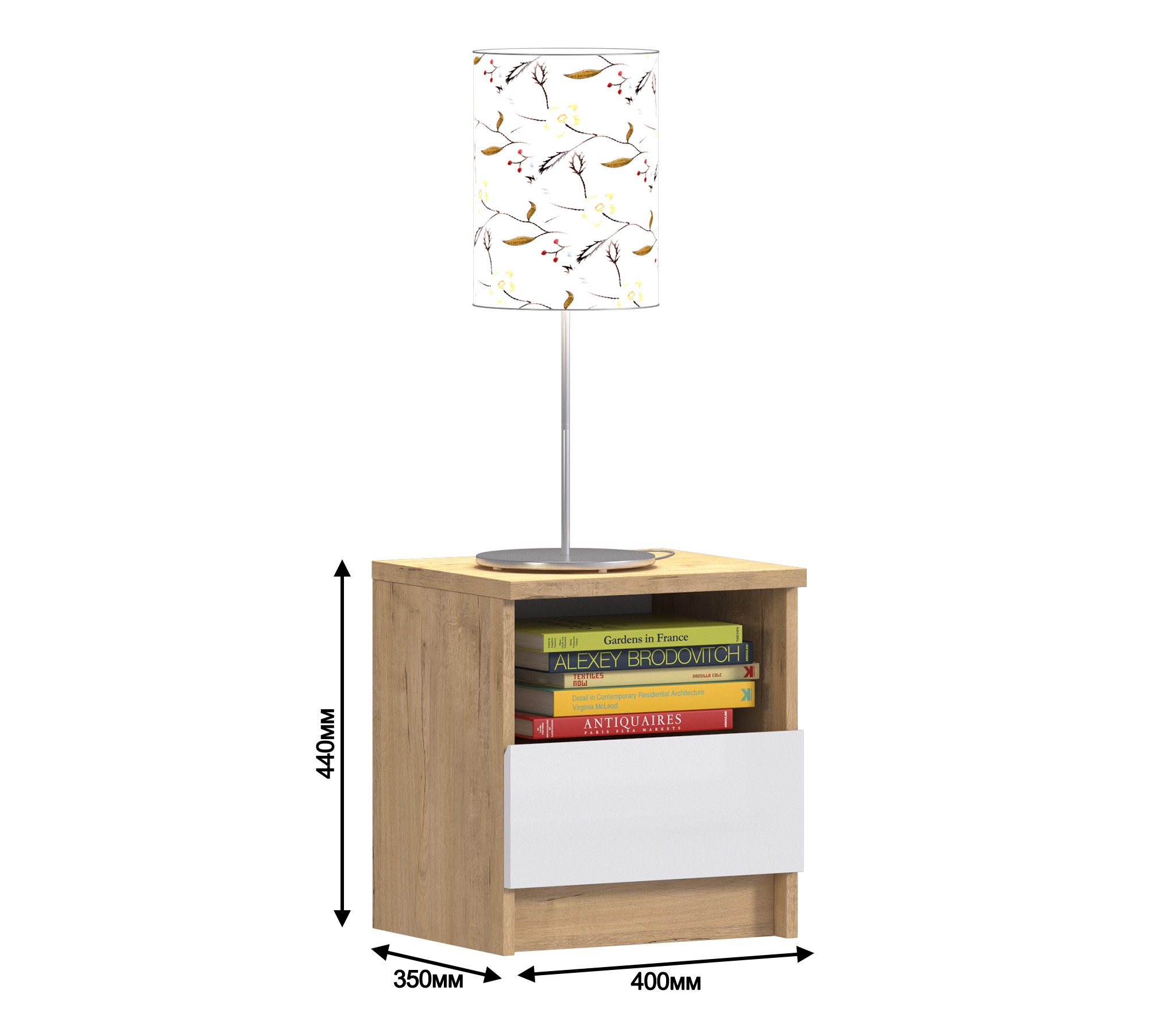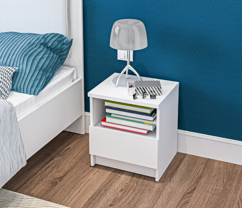 Габаритные размеры тумбы - ширина 40 см, высота 44 см, глубина 35 см, Один выдвижной ящик и открытое отделение, куда положить планшет или книгу. Стиль тумбы современный - Сканди, хай тек. Наиболее выигрышно тумба будет смотреться в интерьере в сочетании с другими предметами мебели из коллекции "Веста". Корпус и фасад тумбы выполнен из современного и прочного ЛДСП.