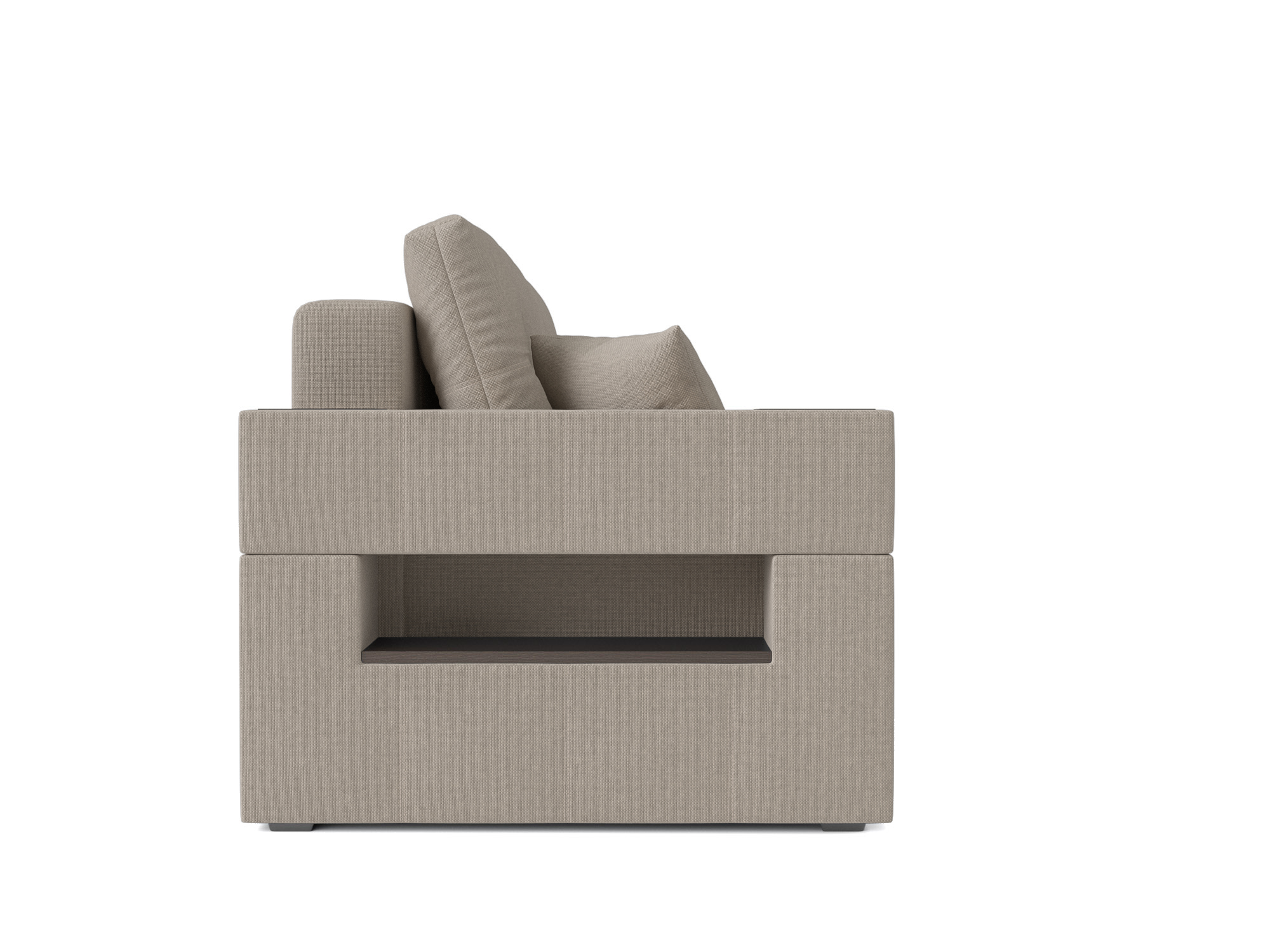 Встроенные в подлокотники ниши удобно использовать как место для расположения книг или небольших элементов декора. Глубокая посадка фиксируется приспинными подушками, поддерживающими правильное положение спины и шеи в положении сидя.