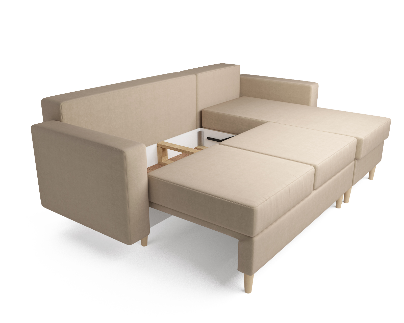 За спальным местом скрывается вместительный ящик-поддон для хранения спальных принадлежностей. Высокие ножки, изготовленные из массива бука создают доступное пространство, что облегчает уборку под диваном. «Белфаст» имеет универсальный угол, позволяющий располагать диван с любой стороны. Каркас выполнен из шлифованного бруса хвойных пород дерева. Мягкие приспинные подушки с пуговкой, поддерживают спину во время чтения книги или просмотра телевизора.