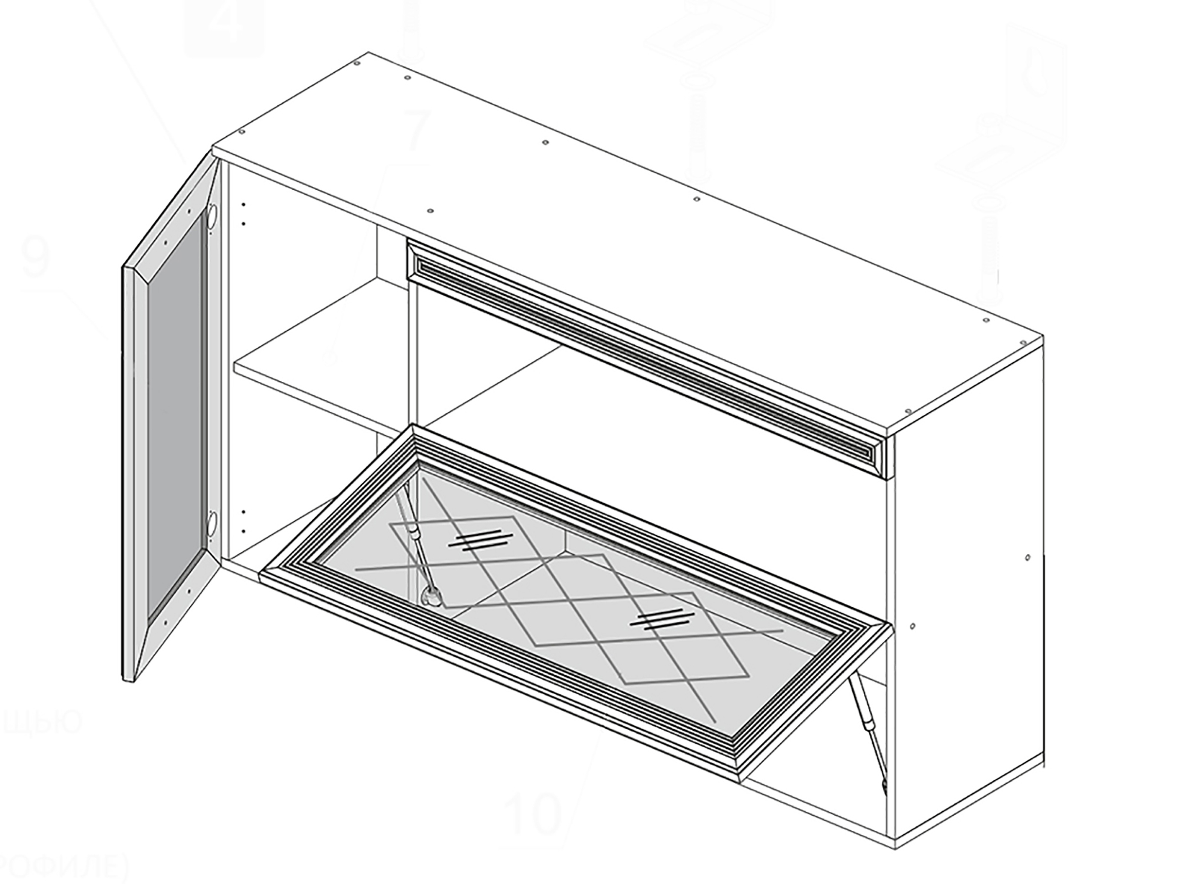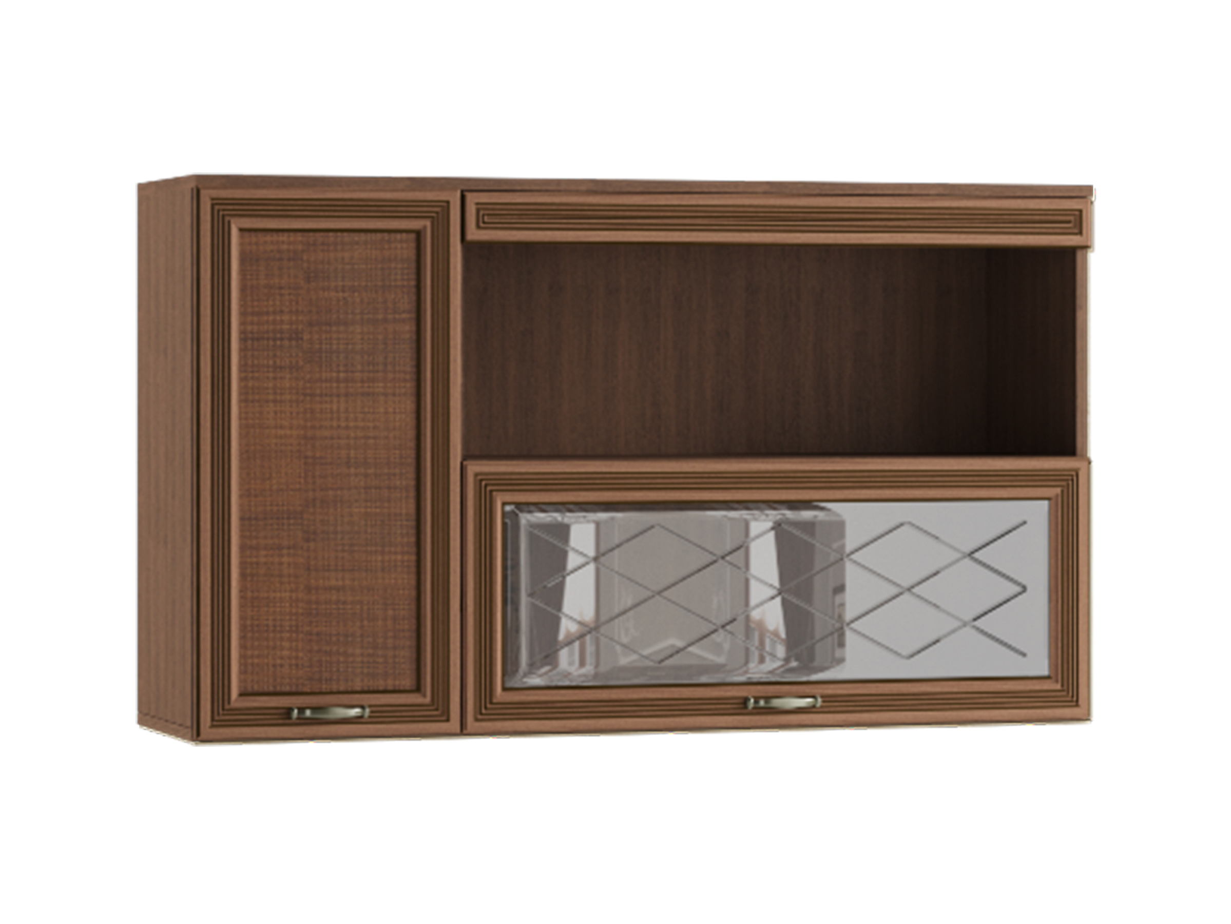 Фурнитура цвета «Старая бронза» (96 мм) прекрасно гармонирует с общим декором, придавая коллекции законченный вид. Петли с доводчиком, навесы, газлифт Стекло/зеркало- 4 мм. Стекло вмонтировано в профиль из МДФ Высота между полками 320-400 мм.