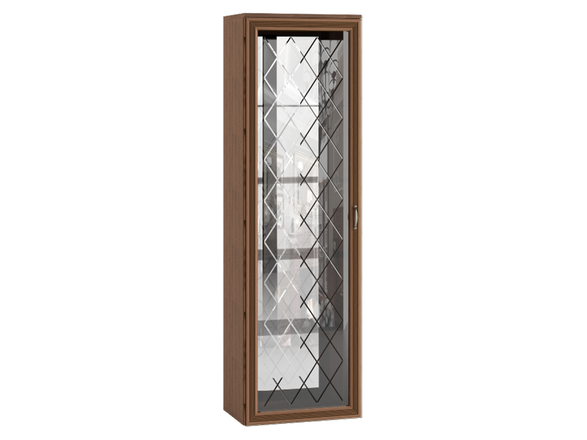Рамочный профиль с патиной, создающей эффект искусственного старения, стекла с фацетной обработкой и гравированным геометрическим узором притягивают взгляд.