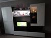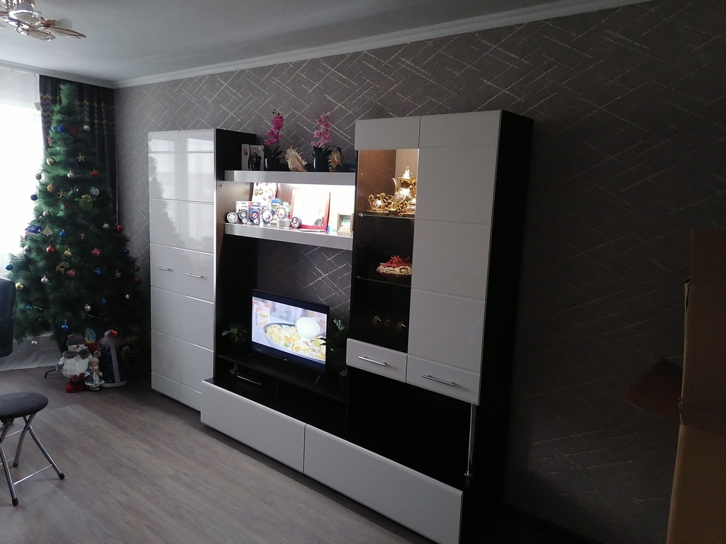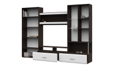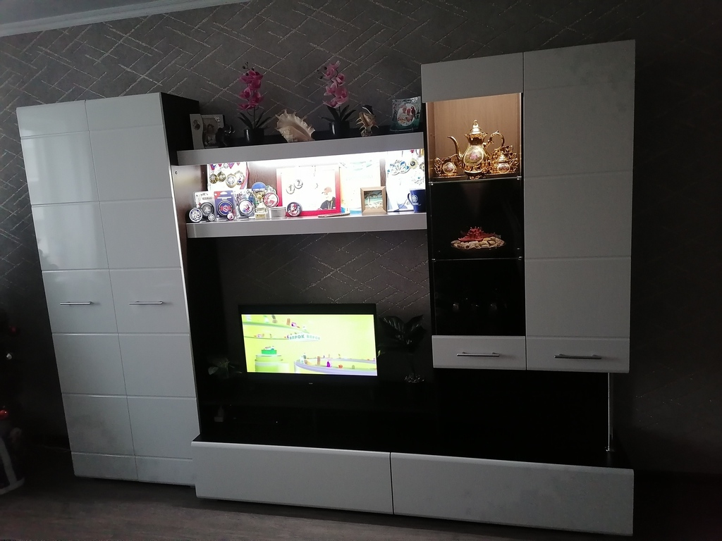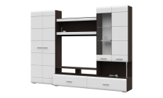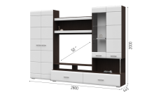 В комплектацию гостиной входят: тумба под ТВ, навесная полка для декоративных предметов, вместительный шкаф с 4 полками, шкаф-витрина, визуально разделённый на 2 части (полки-витрины и закрытые полки). Просторный размер места под ТВ: 1200*885*330 мм позволяет разместить телевизор с довольно большой диагональю.