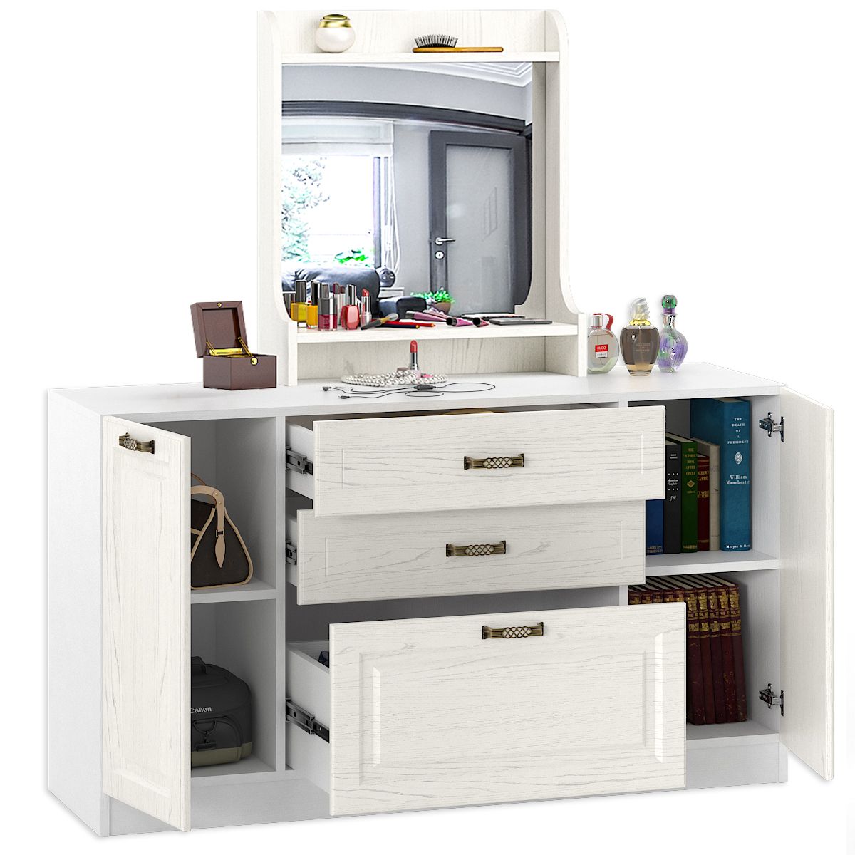 Широкий комод Ливерпуль с зеркалом ясень ваниль/белый - универсальный мебельный комплект - прихожая, гостиная, спальня - везде «ко двору». Комбинированный комод Ливерпуль практично совмещает боковые закрытые отделения с тремя выдвижными ящиками в центре. За распашными дверками на четырёхшарнирных петлях предусмотрена одна полка, выдвижные ящики - на шариковые направляющих. Удобная конструкция, оптимальные размеры и хорошая вместимость делают комод Ливерпуль многоплановым предметом обстановки. Оригинальная полка Ливерпуль 10.118 с большим зеркалом, двумя открытыми полочками и нишей - изысканный атрибут уголка Красоты. Боковые стеночки полки настольной имеют фигурный силуэт, края зеркала украшены фацетом. Мебель выполнена из экологически чистой ламинированной ДСП 16 мм., фасады - МДФ с глубокой фрезеровкой.
