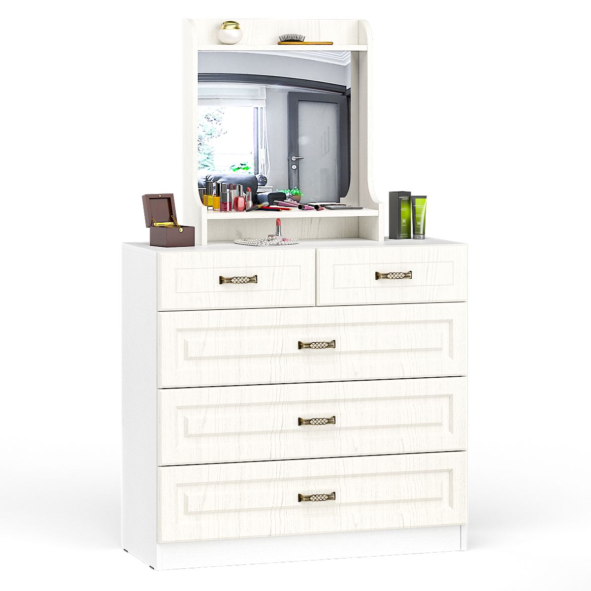 Комод с зеркалом Ливерпуль ясень ваниль/белый - универсальный мебельный комплект - прихожая, гостиная, спальня - везде «ко двору». Компактный и вместительный комод с пятью выдвижными ящиками - практичность и респектабельная простота колониального стиля. Оригинальная полка Ливерпуль 10.118 с большим зеркалом, двумя открытыми полочками и нишей - изысканный атрибут уголка Красоты. Боковые стеночки полки настольной Ливерпуль 10.118 имеют фигурный силуэт, края зеркала украшены фацетом. Мебель выполнена из экологически чистой ламинированной ДСП 16 мм., фасады - МДФ с глубокой фрезеровкой.