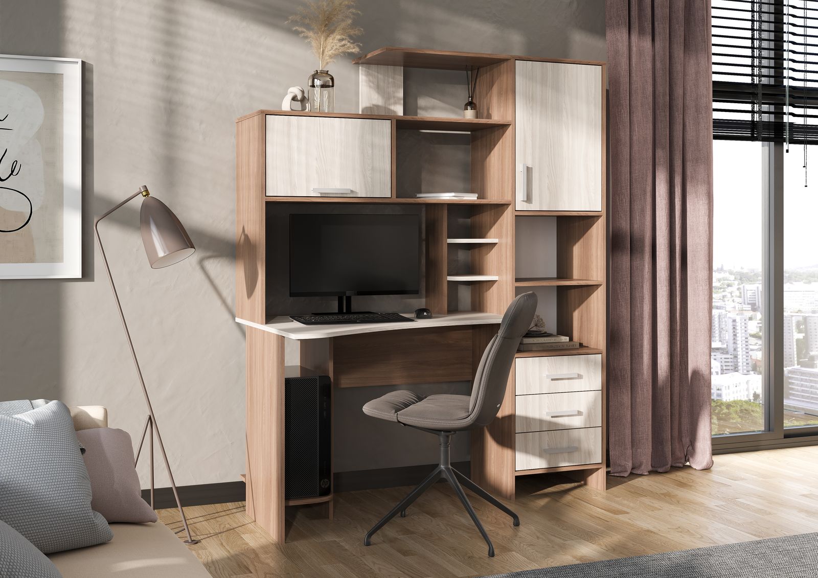Багодаря богатой комплектации, стол компьютерный №6 позволит разместить как компьютерное оборудование, так и большое количество канцелярии и книг. В состав стола входят открытые и закрытые ниши, выдвижные ящики, секция с дверцей на газлифтах и подставка под системный блок. Материал ручек: Пластмасса. Направляющие: роликовые.