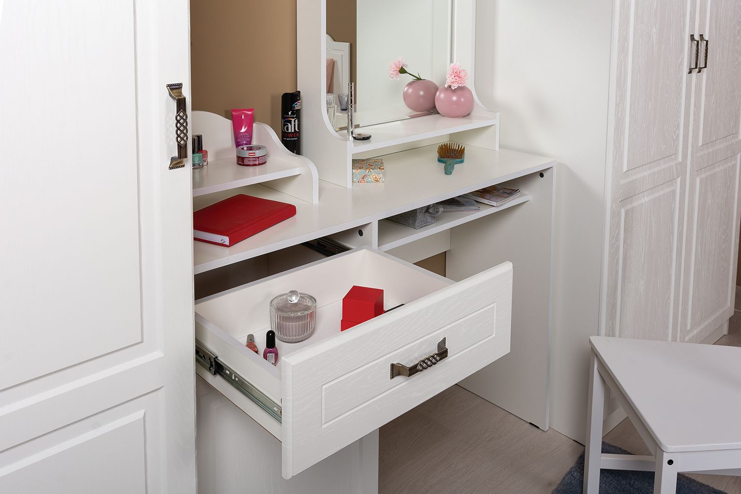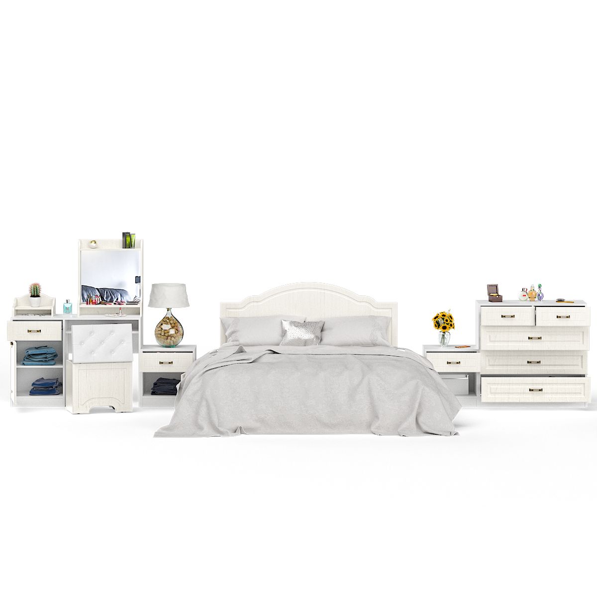 Комплектация и дизайн спального гарнитура Ливерпуль № 2 наследуют практичности и респектабельной простоте колониального стиля. Элегантная кровать с двумя тумбами, вместительный комод, стол туалетный, полка, зеркало и пуф - комфорт и эстетика семейной спальни. Спальное место кровати имеет размер 1600х2000 мм., ортопедическое основание с ножками в комплекте. Матрас приобретается отдельно. Располагая большим выбором матрасов, мы готовы помочь Вам выбрать его и доставить вместе с кроватью. Выдвижной ящик на шариковые направляющих и распашное отделение тумбы Ливерпуль 08.146 - удобное хранение 1000 мелочей! Стол туалетный с зеркалом и настольной полкой Ливерпуль - прелестный дамский уголок, где «работа над собой» превращается в отдых! Широкий, вместительный стол туалетный 12.46 Ливерпуль - раздолье для размещения косметического арсенала Прелестницы! Нарядный и эргономичный стол туалетный обладает практичной глубиной (всего 41 см.) и устойчив, благодаря тумбе, расположенной слева. Большая столешница, полка под ней и тумба с выдвижным ящиком и распашным отделением с полкой - идеальный плацдарм битвы за Молодость! Миниатюрная полочка настольная Ливерпуль 10.117 с изящными фигурными стеночками - место для особо ценных аксессуаров и парфюмерии. Оригинальная полка Ливерпуль 10.118 с большим зеркалом, двумя открытыми полочками и нишей - изысканный атрибут уголка Красоты. Боковые стеночки полки настольной Ливерпуль 10.118 имеют фигурный силуэт, края зеркала украшены фацетом. Роскошный пуфик с уютной крышкой с мягкой обивкой из белоснежной искусственной кожи, так и манит присесть отдохнуть! Эффектная обивка подъёмной крышки украшена «каретной» стяжкой, под крышкой - вместительное отделение для вещей. Установка пуфика Ливерпуль 14.02 на колёсные опоры позволяет расположиться, где Вам удобно и возвратить пуф на его «интерьерное» место! Компактный и вместительный комод с пятью выдвижными ящиками Ливерпуль 10.103 - рациональный подход к оформлению спальни. С самобытным стилем спального гарнитура Ливерпуль № 2 в Вашем доме поселится эстетика прошлого - незабываемый колорит уютного кантри. Нежность пастели мебели, винтажные нотки «состаренного дерева», эксклюзивные ручки - тайна прелести дизайна гарнитура Ливерпуль. Сочетание в отделке мебели цвета «ясень» с выразительным рисунком темных прожилок, имитирует объёмность и фактуру крашеного массива. Спальный гарнитур Ливерпуль № 2 - это просто, но с налётом шика и роскоши, функционально, но очень стильно, практично, но долговечно!