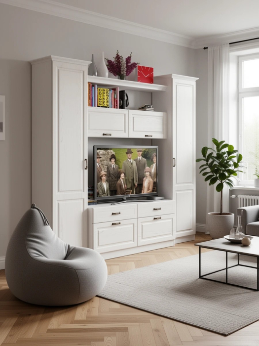 Набор мебели 2 Ливерпуль традиционная обстановка семейного гнезда, где в кругу родных приятно отдохнуть и раствориться в любви. Компактный набор, состоящий из тумбы, шкафа весного, двух шкафов-пеналов с карнизами и полки - классика, когда всё есть и ничего лишнего. Тумба Ливерпуль обладает универсальной функциональностью - это и подставка для телевизора, и закрытая система хранения. Широкая тумба Ливерпуль имеет четыре выдвижных ящика на шариковые направляющих, верхние ящики - менее высокие. Элегантный шкаф навесной Ливерпуль оборудован двумя закрытыми отделениями без полок за откидными фасадами. Шкаф Ливерпуль ценный особенной практичностью - удобным доступом к вещам и экономией полезной площади. Нарядный шкаф-пенал с четырьмя полками за распашной дверью - компактность и эргономика системы хранения. В наборе 2 шкафа-пенала. У каждого хозяина есть что «разложить по полочкам», укрыть от пыли, ультрафиолета и посторонних глаз - это как раз для шкафа-пенала! Стильная, открытая полка Ливерпуль используется составе в гарнитура в качестве оригинального мостика между двумя шкафами-пеналами. Дизайнерское назначение полки Ливерпуль - внесение в ансамбль визуальной лёгкости, живописных акцентов размещённого декора. Крепится полка Ливерпуль к боковинам соседних шкафов-пеналов, крепление к стене не предусмотрено. Комплект карнизов 500 - беспроигрышный дизайнерский ход! В наборе мебели 2 гостиной Ливерпуль два комплекта карнизов 500. Элегантный комплект из трёх карнизов (лицевой и два боковых) довершит эстетический образ модулей гостиной Ливерпуль. Карнизы крепятся к верхнему горизонту шкафов-пеналов, для повышения их «статуса» на мебельном Олимпе. Очаровательный набор 2 для гостиной Ливерпуль выделяет удобную и вместительную нишу размером 140х49х90 см. для телевизора. Набор мебели 2 Ливерпуль для тех, кто устал от минимализма и предпочитает обстановку в духе старины, с оттенком деревенского стиля. С самобытной мебелью Ливерпуль в Вашем доме поселится эстетика прошлого - незабываемый колорит уютного и практичного кантри. Нежность пастели мебели, винтажные нотки «состаренного дерева», эксклюзивные ручки - тайна прелести дизайна набора Ливерпуль. Сочетание в отделке мебели цвета «ясень» с выразительным рисунком темных прожилок, имитирует объёмность и фактуру крашеного массива. Ливерпуль Набор мебели 2 - это просто, но с налётом шика и роскоши, функционально, но очень стильно, практично, но долговечно!