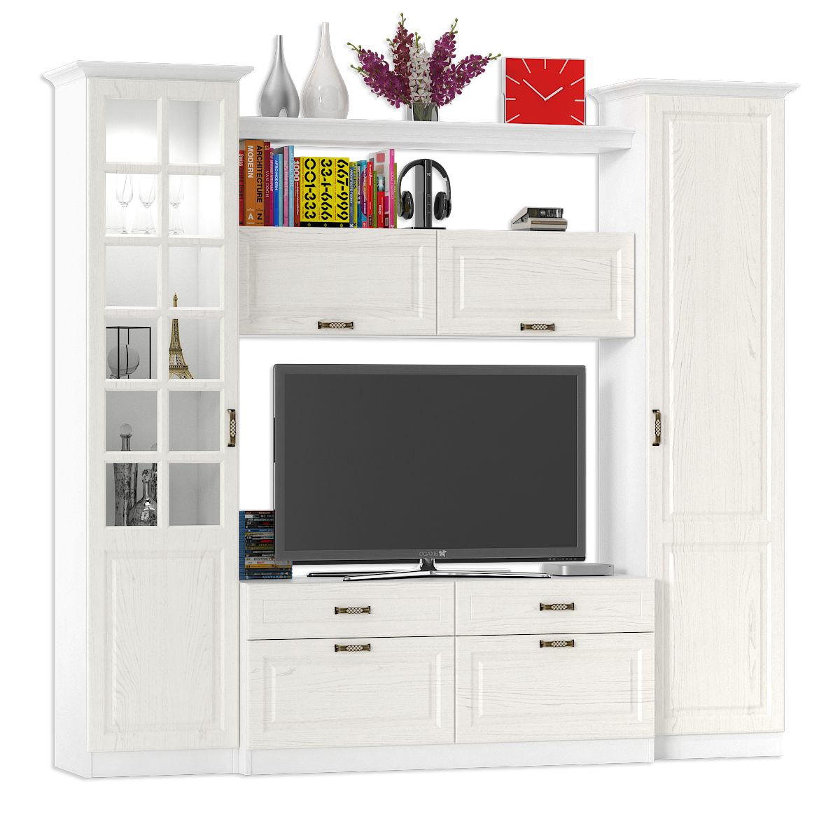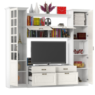 Набор мебели 6 Ливерпуль - традиционная обстановка семейного гнезда, где в кругу родных приятно отдохнуть и раствориться в любви. Компактный набор, состоящий из тумбы, ёх шкафов (навесного, пенала и витрины) и полки - классика стиля, когда всё есть и ничего лишнего. Тумба Ливерпуль обладает универсальной функциональностью - это и подставка для телевизора, и закрытая система хранения. Широкая тумба Ливерпуль имеет четыре выдвижных ящика на шариковые направляющих, верхние ящики - менее высокие. Элегантный шкаф навесной Ливерпуль оборудован двумя закрытыми отделениями без полок за откидными фасадами. Шкаф навесной Ливерпуль ценный особенной практичностью - удобным доступом к вещам и экономией полезной площади. Нарядный шкаф-пенал с четырьмя полками за распашной дверью - компактность и эргономика системы хранения. У каждого хозяина есть что «разложить по полочкам», укрыть от пыли, ультрафиолета и посторонних глаз - это как раз для шкафа-пенала! Изящный, распашной шкаф-витрина, с двумя стеклополками и двумя полки из ДСП, полностью готов отвечать за сервировку трапезы. Витринная часть шкафа-витрины Ливерпуль презентабельно разместит праздничную посуду, закрытая - припрячет столовый текстиль. В крышке шкафа-витрины Ливерпуль предусмотрен спот врезной - для акцентной подсветки фамильных сервизов и живописного декора. Стильная, открытая полка Ливерпуль используется составе в стенки в качестве оригинального мостика между двумя шкафами. Дизайнерское назначение полки Ливерпуль - внесение в ансамбль визуальной лёгкости, живописных акцентов размещённого декора. Крепится полка Ливерпуль к боковинам соседних шкафов (пенала и витрины), крепление к стене не предусмотрено. Комплект карнизов 500 - беспроигрышный дизайнерский ход! В наборе мебели 6 гостиной Ливерпуль два комплекта карнизов 500. Элегантный комплект из трёх карнизов (лицевой и два боковых) довершит эстетический образ модулей гостиной Ливерпуль. Карнизы крепятся к верхнему горизонту шкафа-пенала и шкафа-витрины, для повышения их «статуса» на мебельном Олимпе. Очаровательный набор 6 для гостиной Ливерпуль выделяет удобную и вместительную нишу размером 140х49х90 см. для телевизора. Универсальная сборка набора мебели 6 Ливерпуль - ещё один шаг к комфорту и уюту Вашей гостиной. Набор мебели 6 Ливерпуль для тех, кто устал от минимализма и предпочитает обстановку в духе старины, с оттенком деревенского стиля. С самобытной мебелью Ливерпуль в Вашем доме поселится эстетика прошлого - незабываемый колорит уютного и практичного кантри. Нежность пастели мебели, винтажные нотки «состаренного дерева», эксклюзивные ручки - тайна прелести дизайна набора Ливерпуль. Сочетание в отделке мебели цвета «ясень» с выразительным рисунком темных прожилок, имитирует объёмность и фактуру крашеного массива. Ливерпуль Набор мебели 6 - это просто, но с налётом шика и роскоши, функционально, но очень стильно, практично, но долговечно!