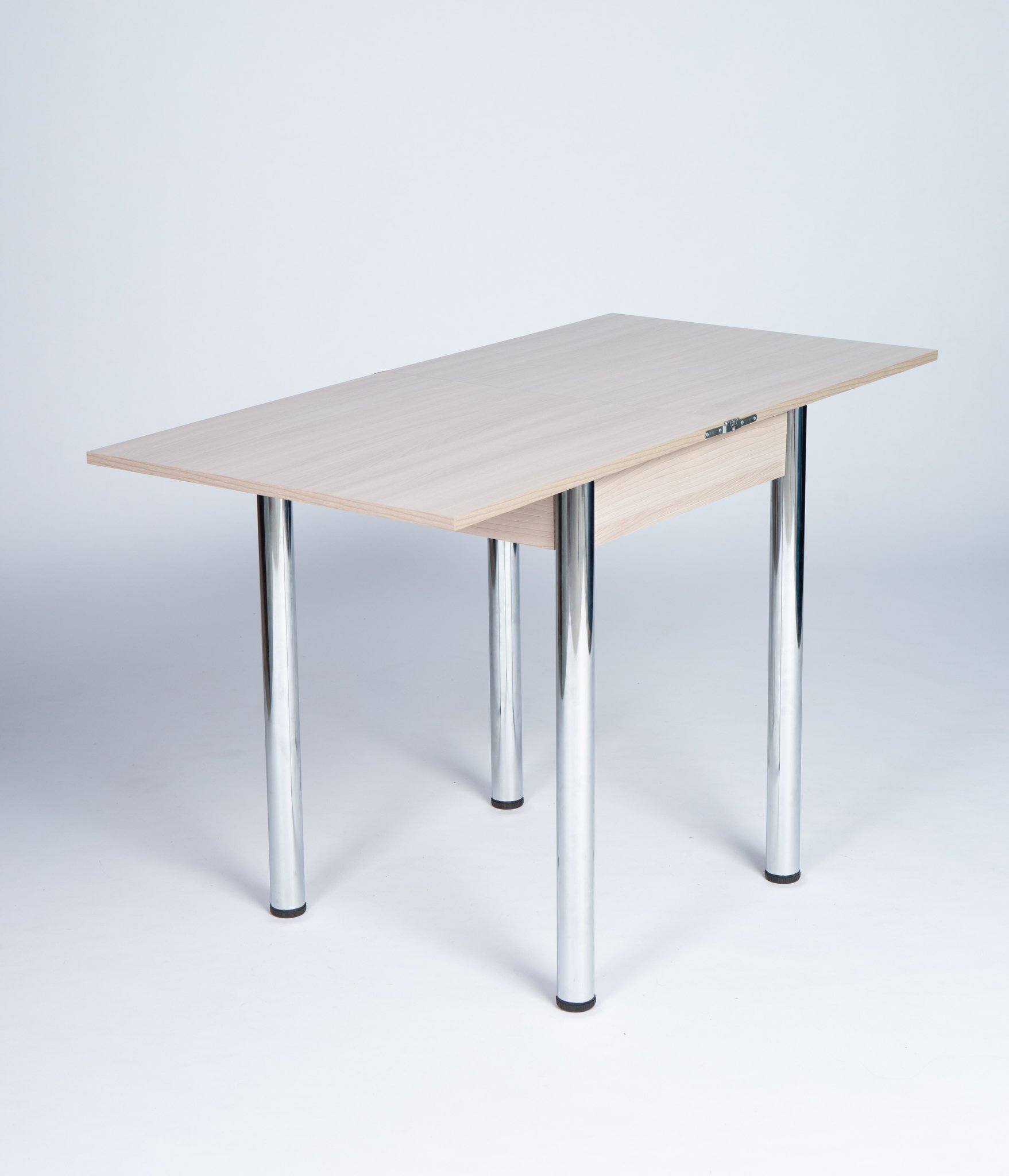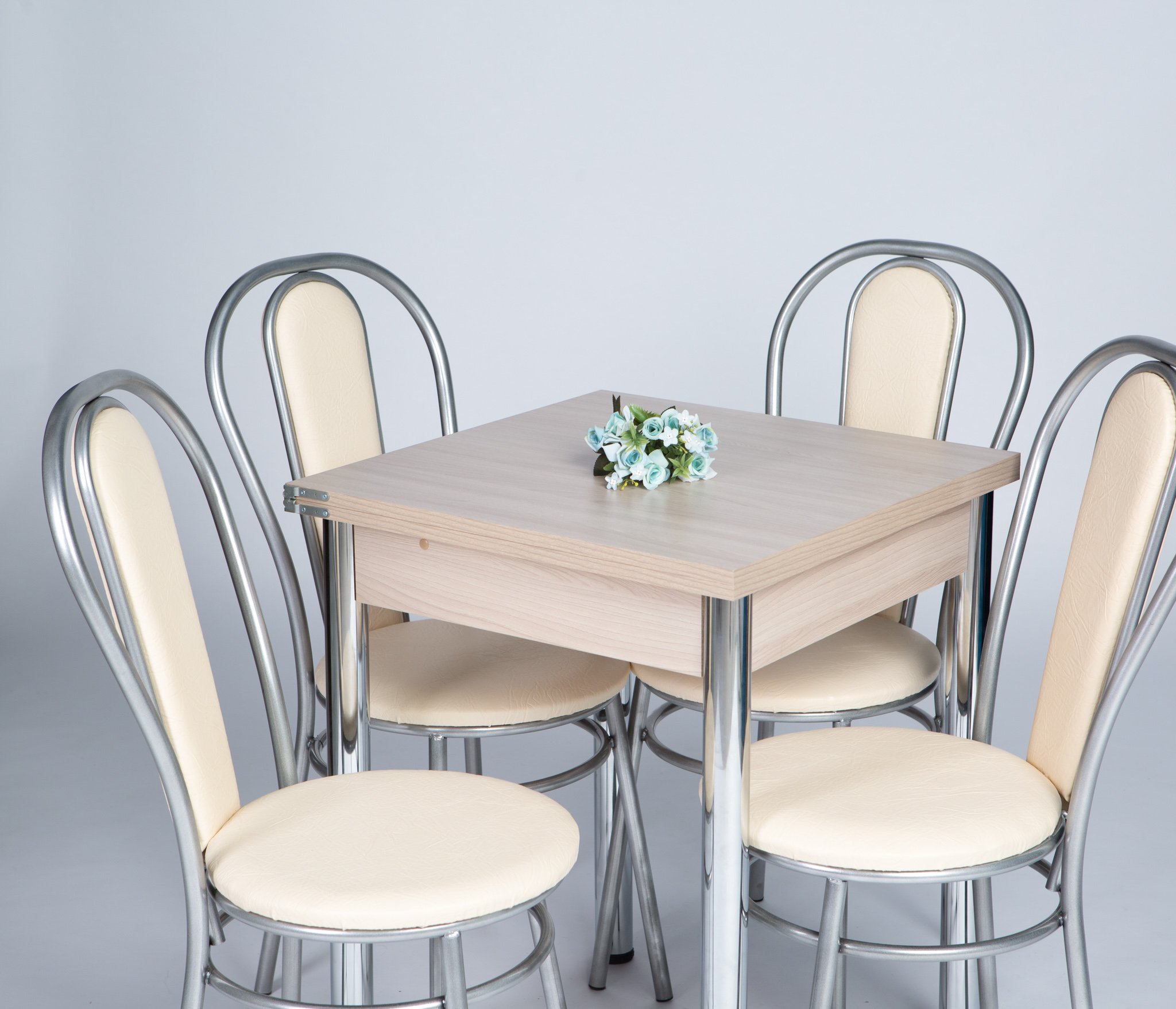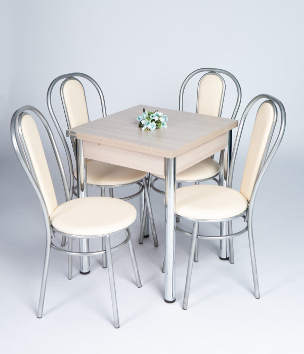 обеденная группа 60 состоит из стола раскладного в сложенном виде 60*60,в разложенном 60*120см..Ножки Хромированные труба d-50 регулируемая .В комплекте 4 Стула на металлокаркасе,сидение и спинка мягкие(наполнение поролон,обивка экокожа).Ножки Хром серый.