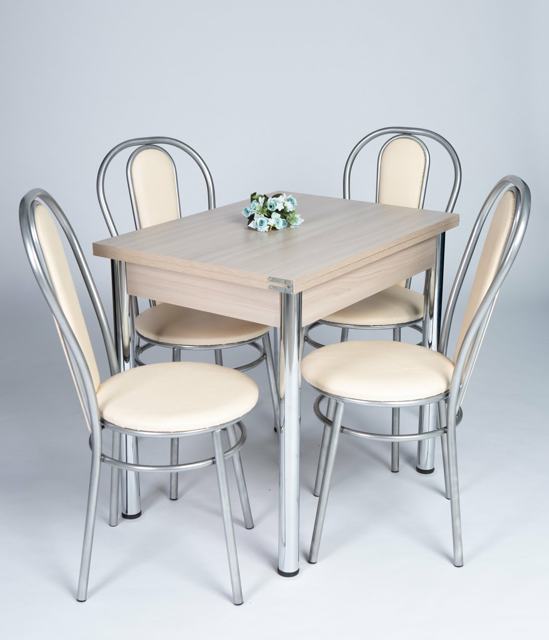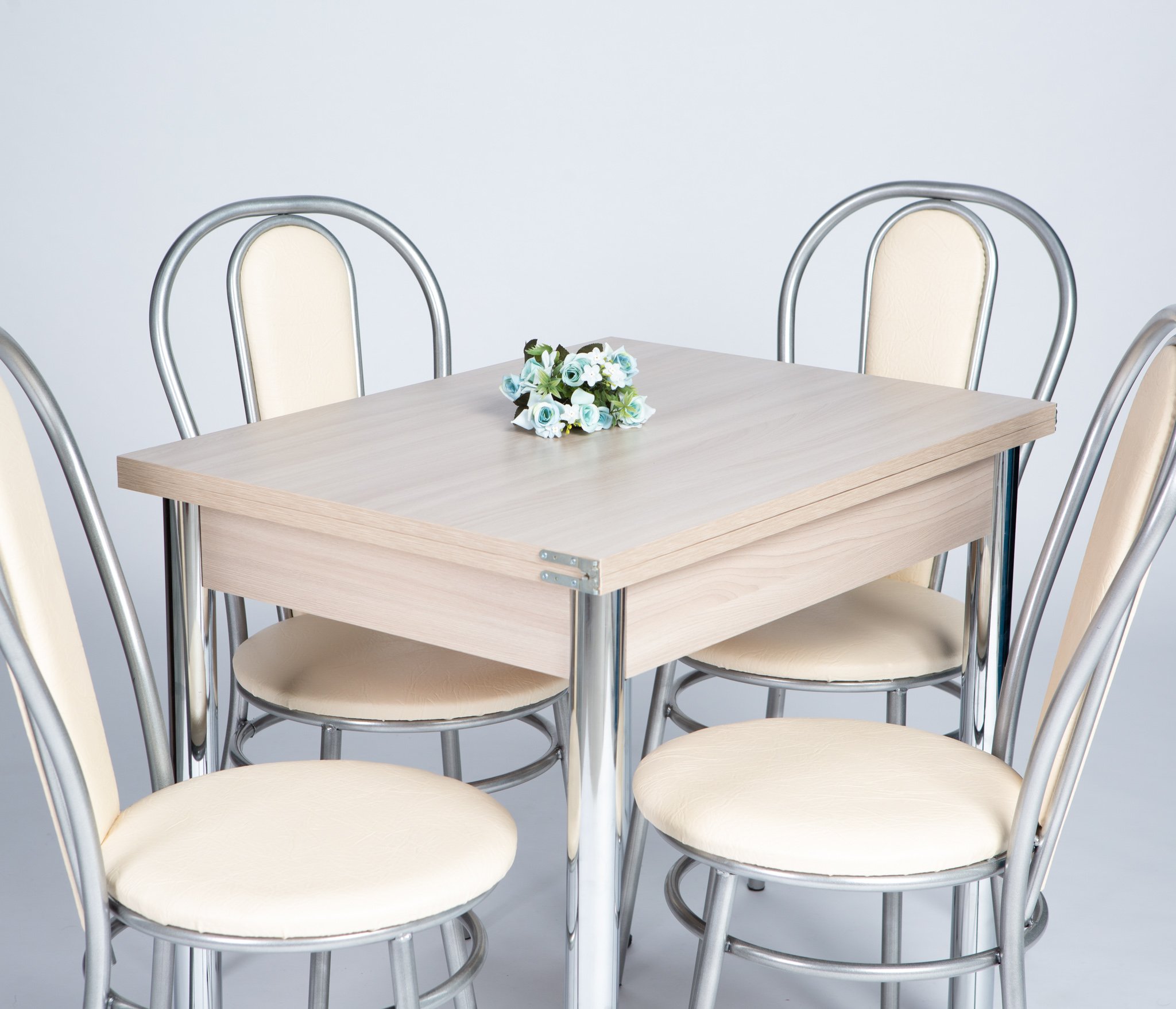 Обеденная группа 80 состоит из стола раскладного в сложенном виде 60*80,в разложенном 80*120см..Ножки Хромированные труба d-50 регулируемая .В комплекте 4 Стула на металлокаркасе,сидение и спинка мягкие(наполнение поролон,обивка экокожа).Ножки Хром серый.