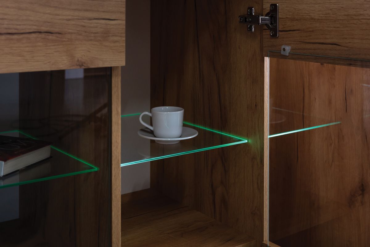 Тумба ТВ Арчи 10.85 - широкая невысокая тумба поможет с большим вкусом и комфортом обустроить зону отдыха в Вашей гостиной. На верхнем горизонте тумбы достаточно места для телевизора любой диагонали. Нижняя часть тумбы представлена закрытой распашной дверкой нишей и открытой нишей со стеклянной полочкой и светодиодной подсветкой. Тумба ТВ Арчи 10.85 - модуль из набора мебели для гостиной Арчи.