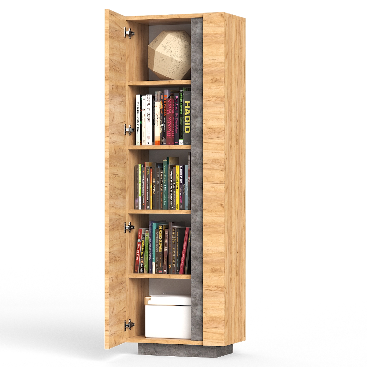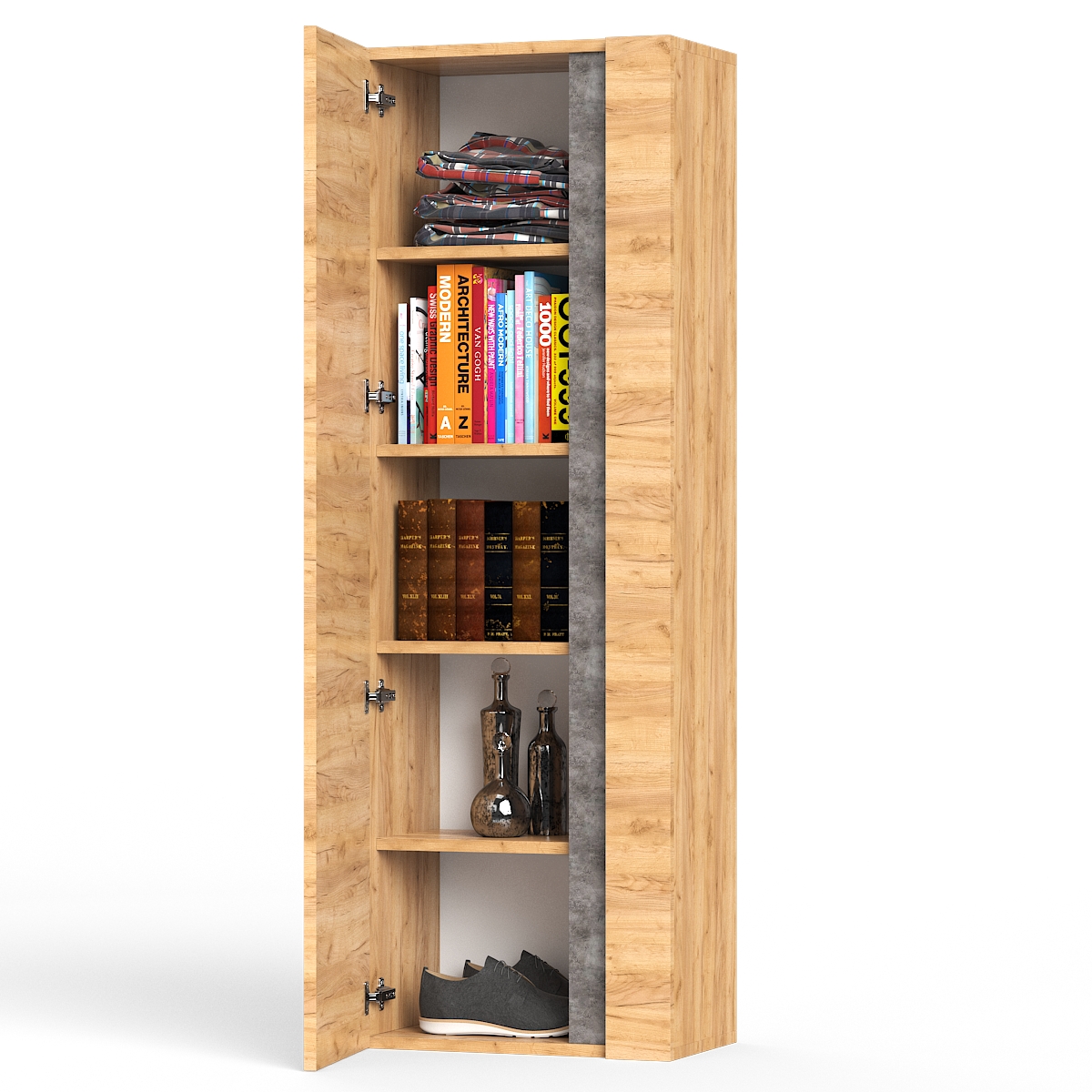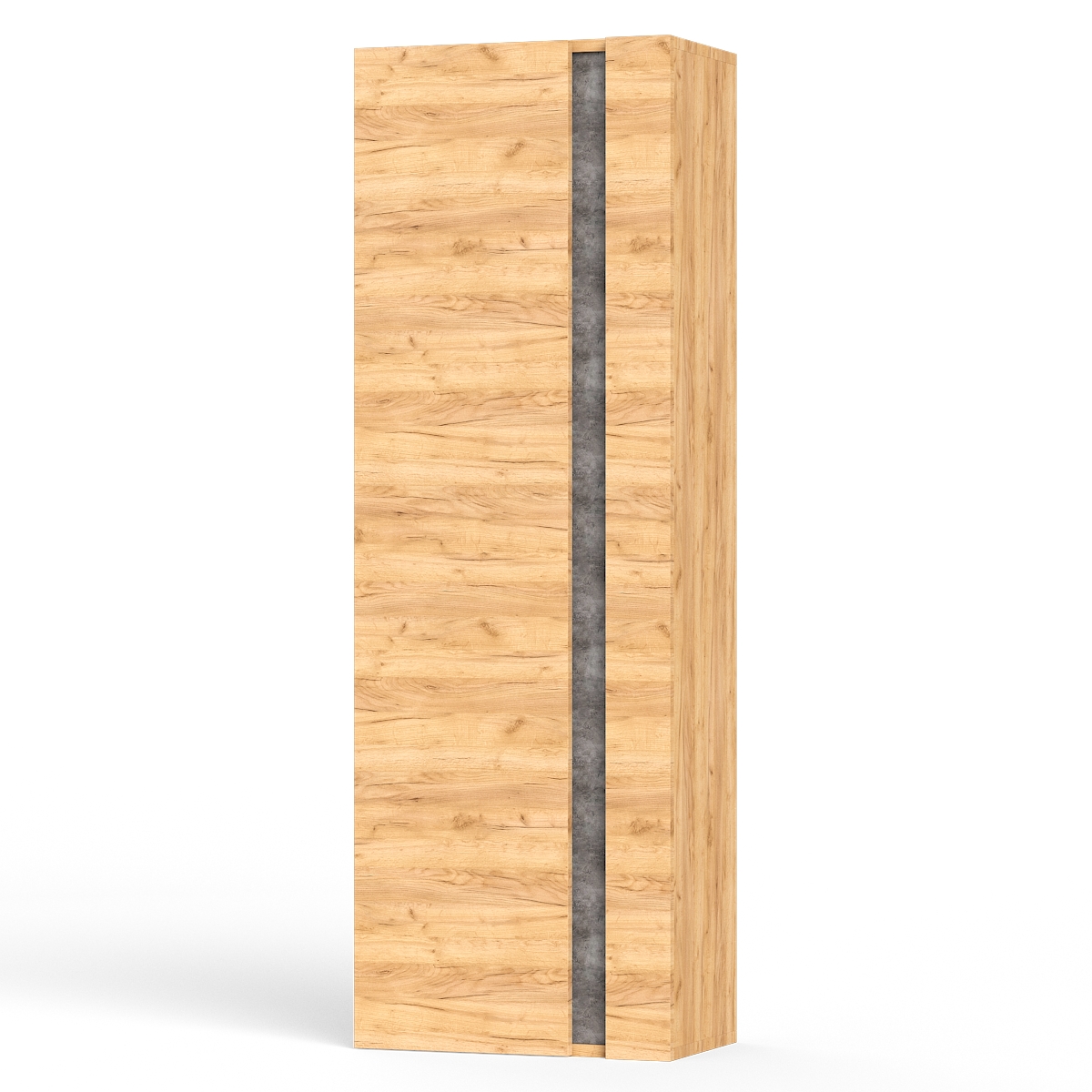 Шкаф комбинированный Арчи 10.05 дуб крафт золотой/камень тёмный - высокий узкий шкаф станет ярким мебельным акцентом в интерьере гостиной. За распашной дверкой шкафа расположены четыре полочки. Дверка открывается за край фасада. Универсальность модуля заключается в том, что при первой сборке Вы можете выбрать в какую сторону будет открываться дверка шкафа. Шкаф можно использовать как самостоятельную мебельную единицу или в составе мебельной композиции. Дизайн шкафа позволяет установить его на тумбу для телевизора, при этом цоколь шкафа не используется и высота шкафа меняется с 155 до 148 см. Шкаф комбинированный Арчи 10.05 - модуль из набора мебели для гостиной Арчи.