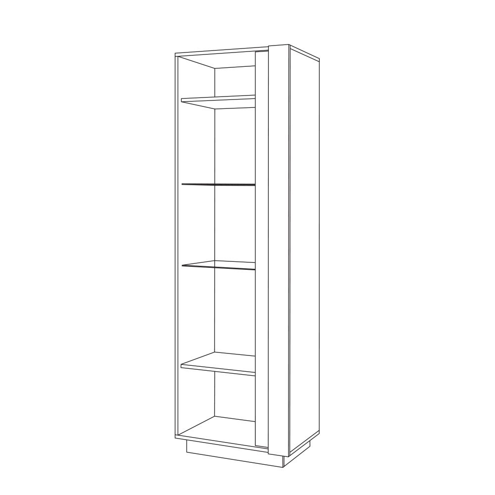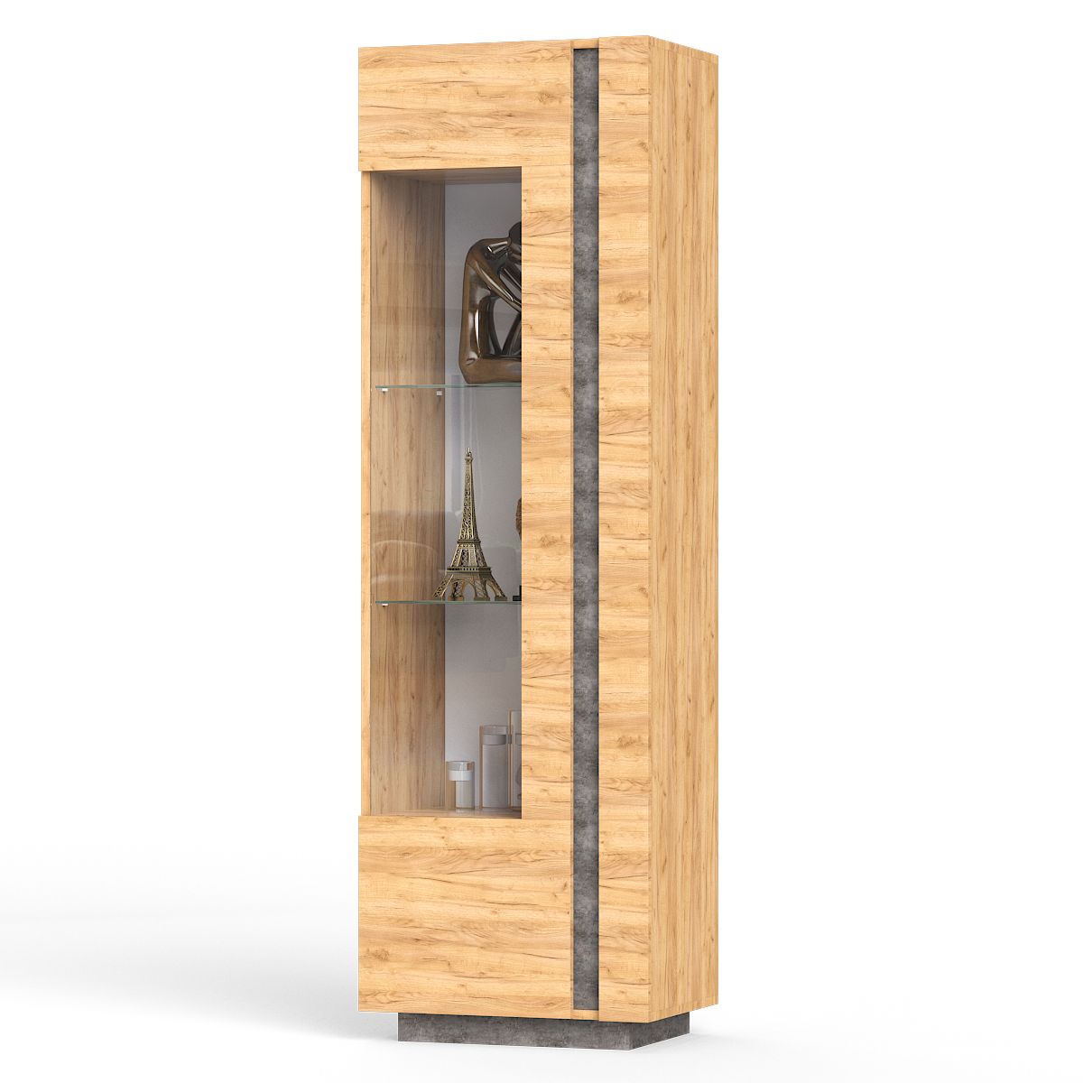 Шкаф-витрина с подсветкой Арчи 03.263 дуб крафт золотой/камень тёмный - высокий шкаф-витрина украсит Ваш дом и станет ярким мебельным акцентом в интерьере гостиной. Дизайн шкафа отличается оригинальной стеклянной вставкой на фасаде, за которой расположены стеклянные полочки, декорированные светодиодной подсветкой. Вы можете использовать шкаф-витрину в качестве серванта, витрины, буфета, хранить в нём вещи, книги, одежду, документы. Назначение шкафа-витрины универсально. Подсветка полочек поможет создать романтическую обстановку в вечернее время суток без использования дополнительных источников света. Шкаф-витрина с подсветкой Арчи 03.263 - модуль из набора мебели для гостиной Арчи.