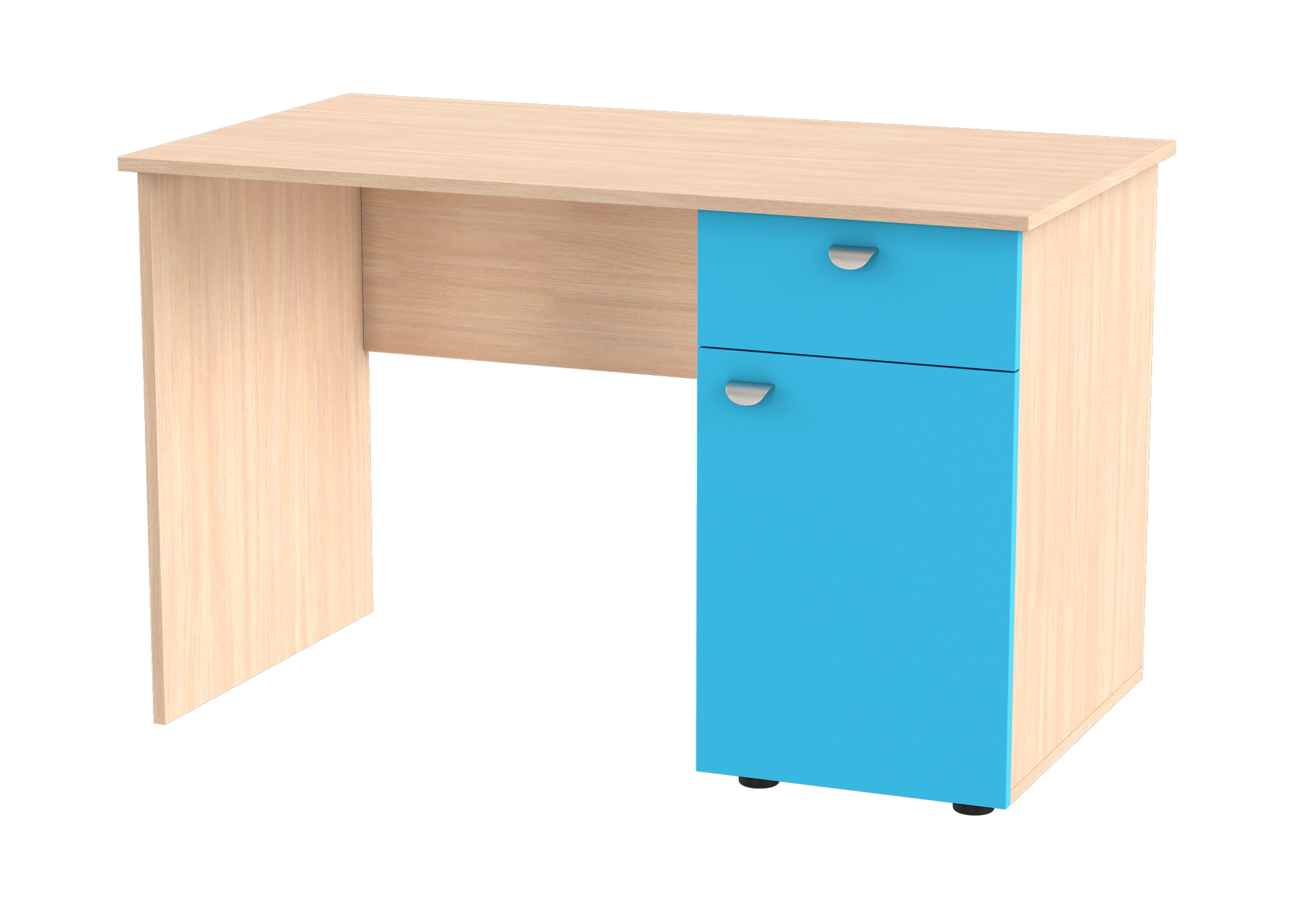 Стол оснащен одним выдвижным ящиком и закрытой тумбой с двумя полками. Производится из высокачественной ЛДСП. Стильный и прочный.