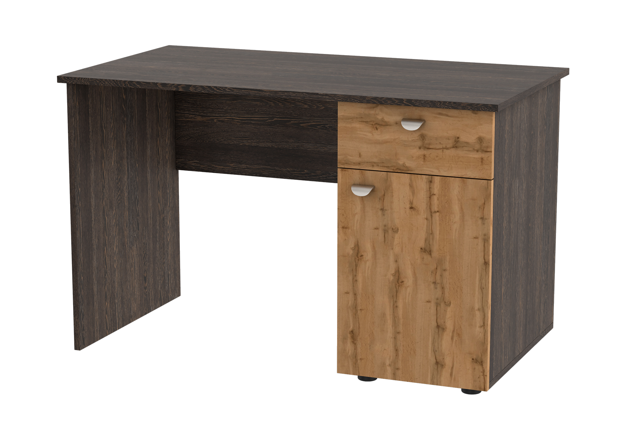 Стол оснащен одним выдвижным ящиком и закрытой тумбой с двумя полками. Производится из высокачественной ЛДСП. Стильный и прочный.