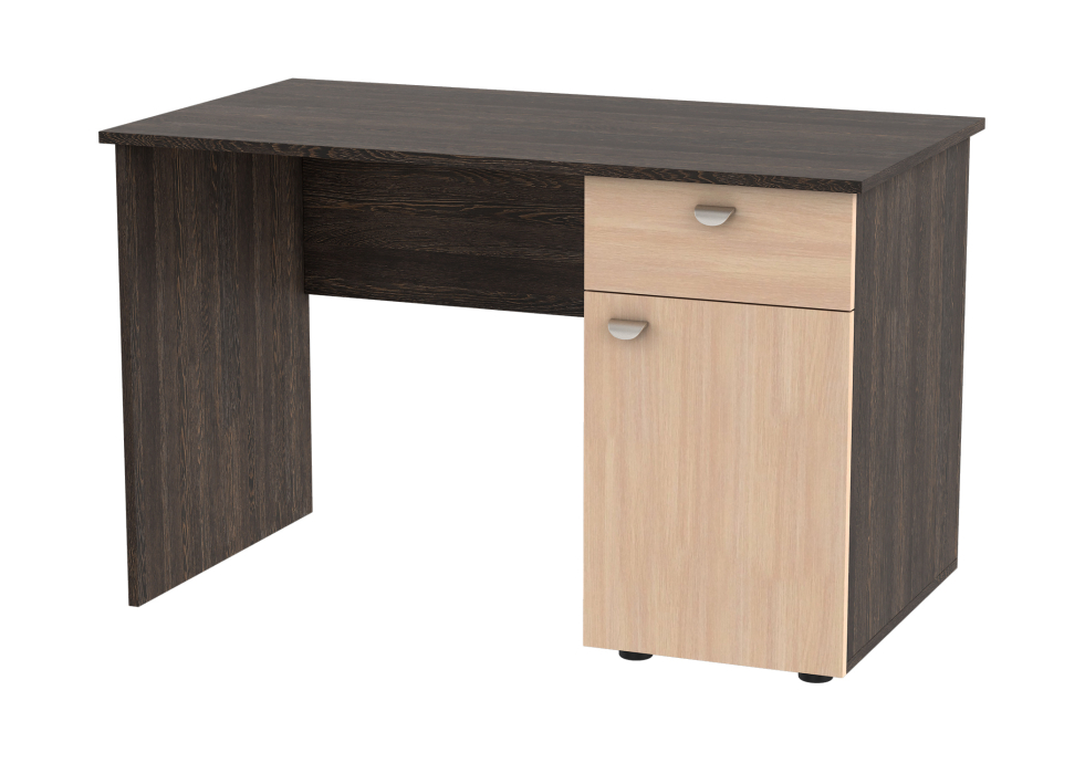 Стол оснащен одним выдвижным ящиком и закрытой тумбой с двумя полками. Производится из высокачественной ЛДСП. Стильный и прочный.