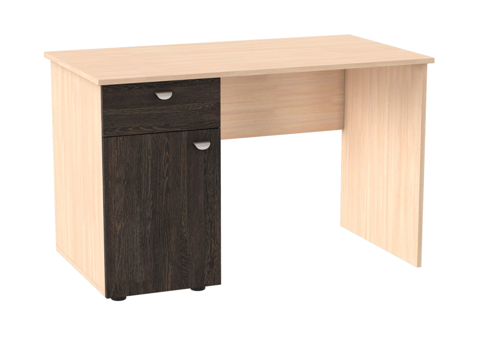 Стол оснащен одним выдвижным ящиком и закрытой тумбой с двумя полками. Производится из высокачественной ЛДСП. Стильный и прочный.