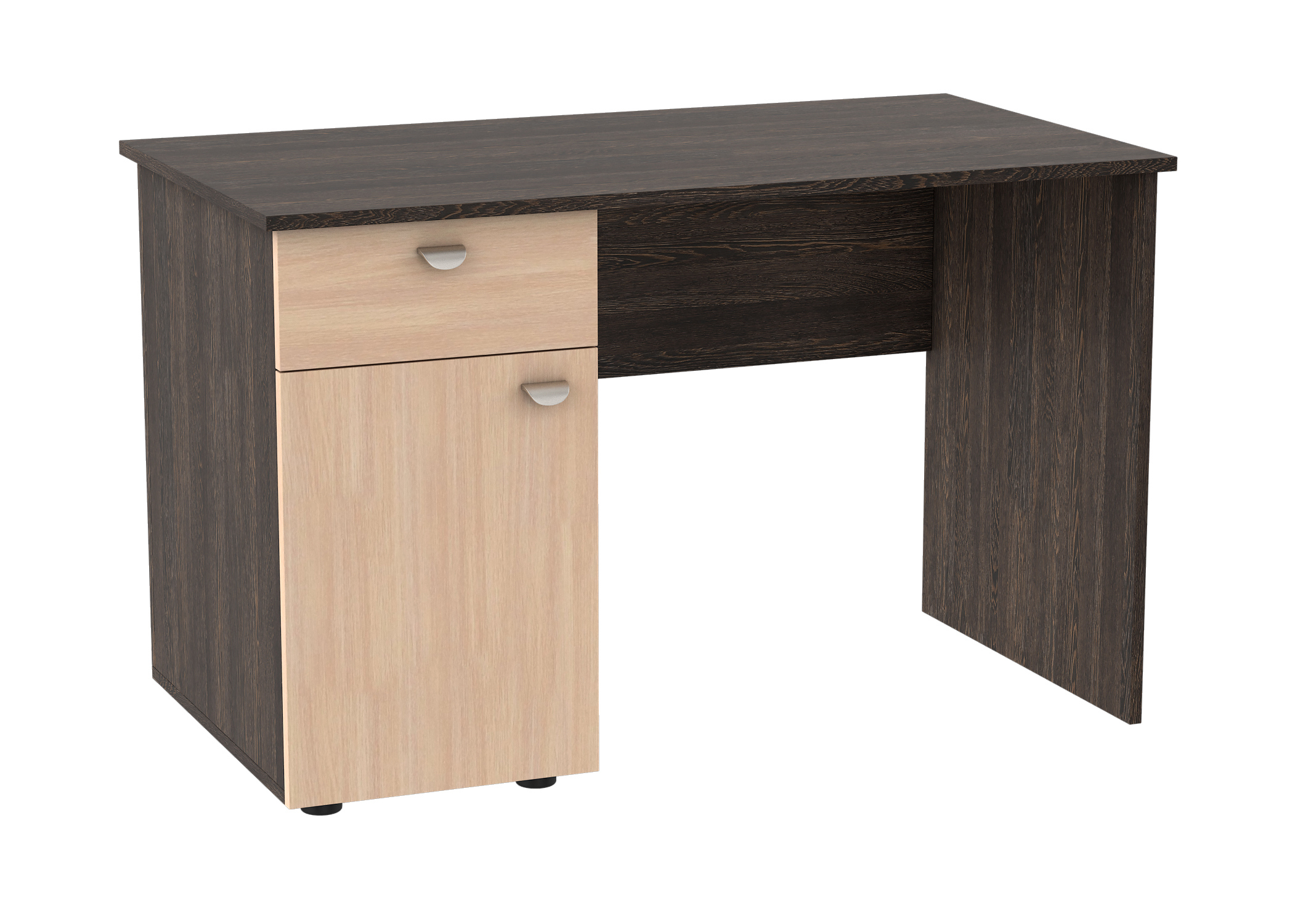 Стол оснащен одним выдвижным ящиком и закрытой тумбой с двумя полками. Производится из высокачественной ЛДСП. Стильный и прочный.