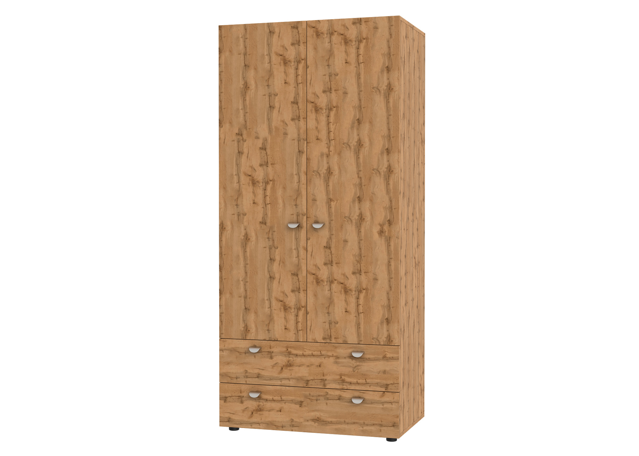 В нижней части шкафа имеется два выдвижных ящика для хранения одежды или белья, которые легко заменяют комод. Место под верхней полкой оборудовано овальной штангой, для подвеса одежды на плечики и скрыты за двумя распашными дверцами.