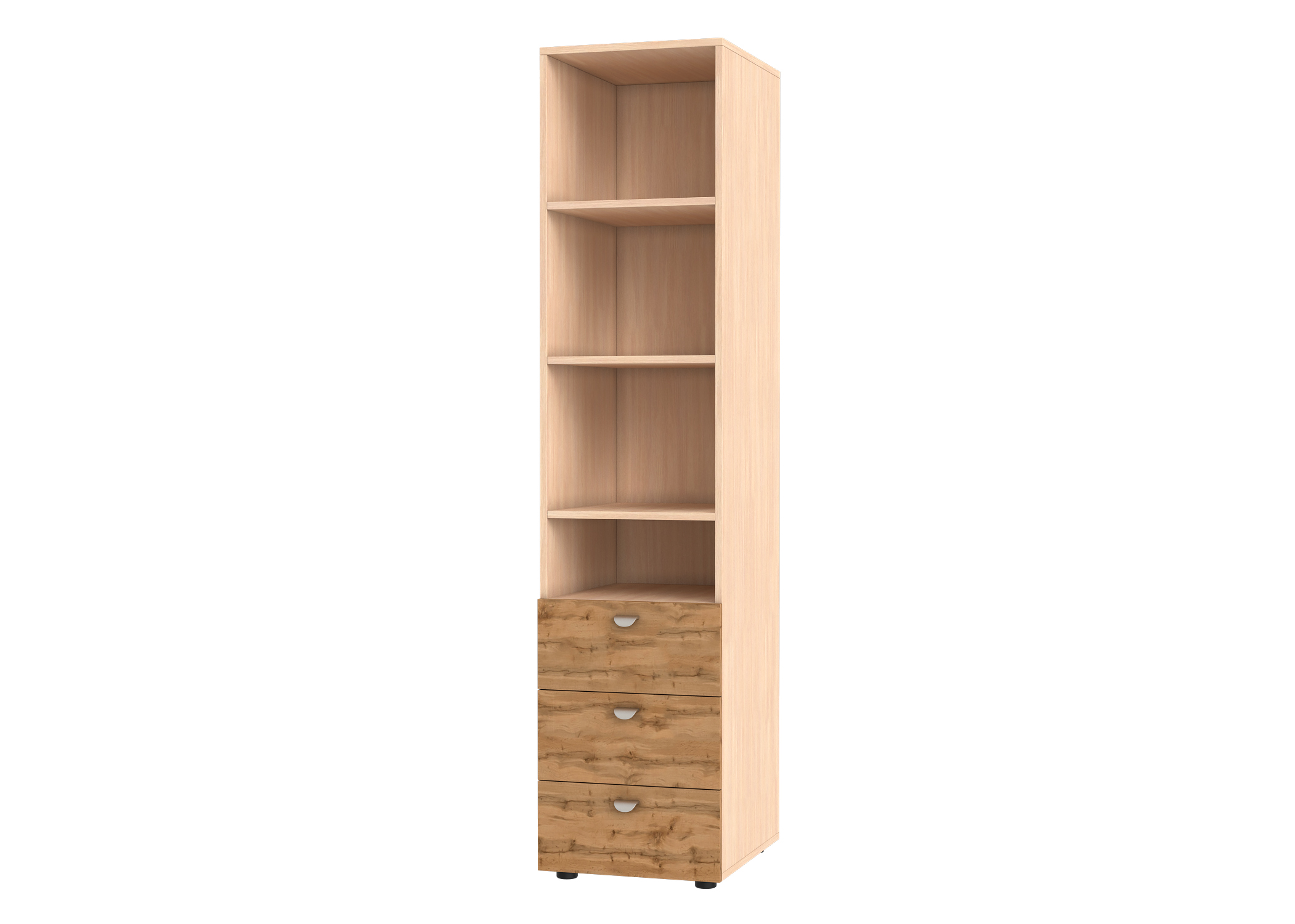 Четыре просторные полки, три выдвижных ящика, приятная цветовая гамма, качественное техническое исполнение и экологические материалы изготовления – все это превращает весьма скромный стеллаж в желанного гостя, которому будут рады и взрослые, и дети.