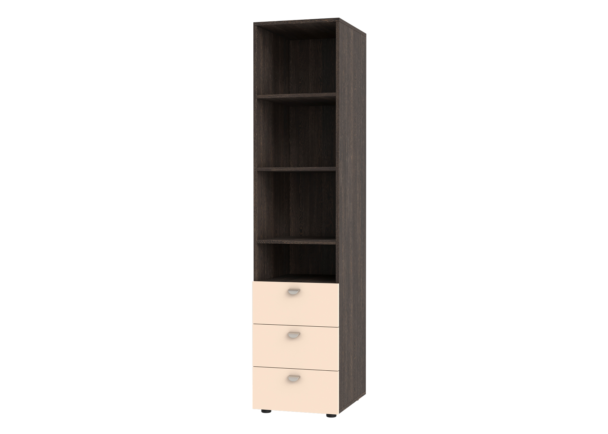 Четыре просторные полки, три выдвижных ящика, приятная цветовая гамма, качественное техническое исполнение и экологические материалы изготовления – все это превращает весьма скромный стеллаж в желанного гостя, которому будут рады и взрослые, и дети.