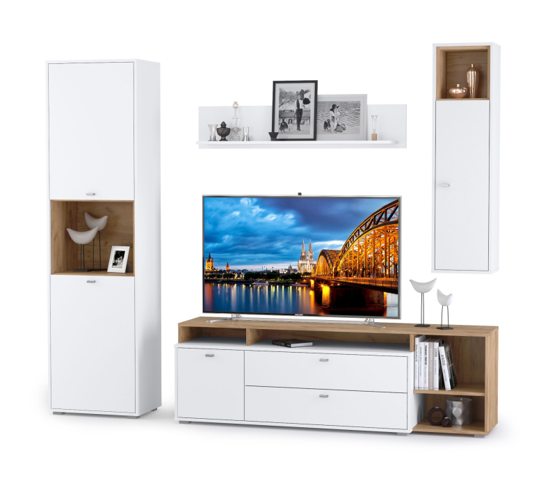 Гостиная Бэль № 03 дуб крафт золотой/белый премиум - изысканная красота и модный шик в интерьере. Эстетичная гостиная Бэль № 03, состоящая из тумбы, полки, шкафа навесного и пенала - пьедестал под ТВ и система комфортного хранения. Бэль гостиная № 03 создана для почитателей лаконичной геометрии форм и креативной, но ненавязчивой и практичной обстановки. Декоративный стиль гостиной Бэль таит нотки конструктивизма, позволяя реализовывать смелые идеи за счёт игры с пространством. Сочетание строгих, вертикальных и горизонтальных линий, и природная теплота элементов отделки, создают эффект визуальной динамики. Модули гостиной Бэль № 03 покоряют практичностью, сдержанность форм и интригуют выразительным цветовым миксом. Широкая тумба Бэль с удобным местом для телевизора любой диагонали - идеальная основа для домашнего кинотеатра. Практичная комбинация открытых ниш, закрытого отделения и двух вместительных выдвижных ящиков - отличный вариант системы хранения. Открытая навесная полка Бэль поможет расставить акценты и разнообразить цветовую гамму гостиной калейдоскопом размещённого декора. Изящный, глубиной всего 27 см., навесной шкафчик поможет создать динамичный интерьер, с иллюзией открытого и светлого пространства.