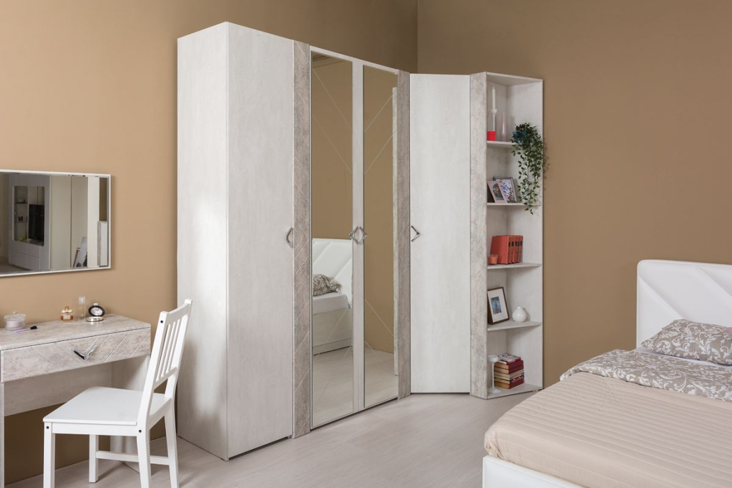 Набор шкафов Амели НШ № 1 шёлковый камень/бетон чикаго беж - практичная угловая шкафная композиция, вместительная, с рациональным наполнением. Элегантный набор шкафов № 1 включает четыре максимально высоких шкафа - пенал 08.49, двустворчатый 13.133, угловой 13.131 и стеллаж 13.133. Удобный распашной шкаф для одежды Амели Моби 13.133 оборудован двумя полками и горизонтальной штангой для вешалок. Обе двери шкафа для одежды декорированы зеркалом, во всю длину двери, что позволит Вам выбрать наряд прямо «на одном месте»! Зеркальное полотно и фасад шкаф для одежды украшены зигзагами и полосками фрезеровки, характерными всегда модному стилю ар-деко. Угловой шкаф Амели Моби 13.131 - связующий модуль этой рациональной мебельной комбинации и существенное дополнение системы хранения. Одностворчатый угловой шкаф Амели Моби 13.131, за распашной дверью, оборудован пятью полками и штангой для одежды на вешалках. Компактный, одностворчатый распашной пенал-шкаф Амели Моби 08.49 с пятью полками - идеальная форма хранения белья и личных вещей. Стеллаж Амели Моби 13.140 - идеальное окончание мебельной стеночки., компактное, изящное, с лёгким доступом к предметам. Открытый стеллаж с четырьмя полочками - лучший способ сделать гарнитур визуально более лёгким и живописным за счёт изысканного декора. Универсальная сборка набора шкафов Амели Моби № 1 позволит составить максимально эргономичный гарнитур.