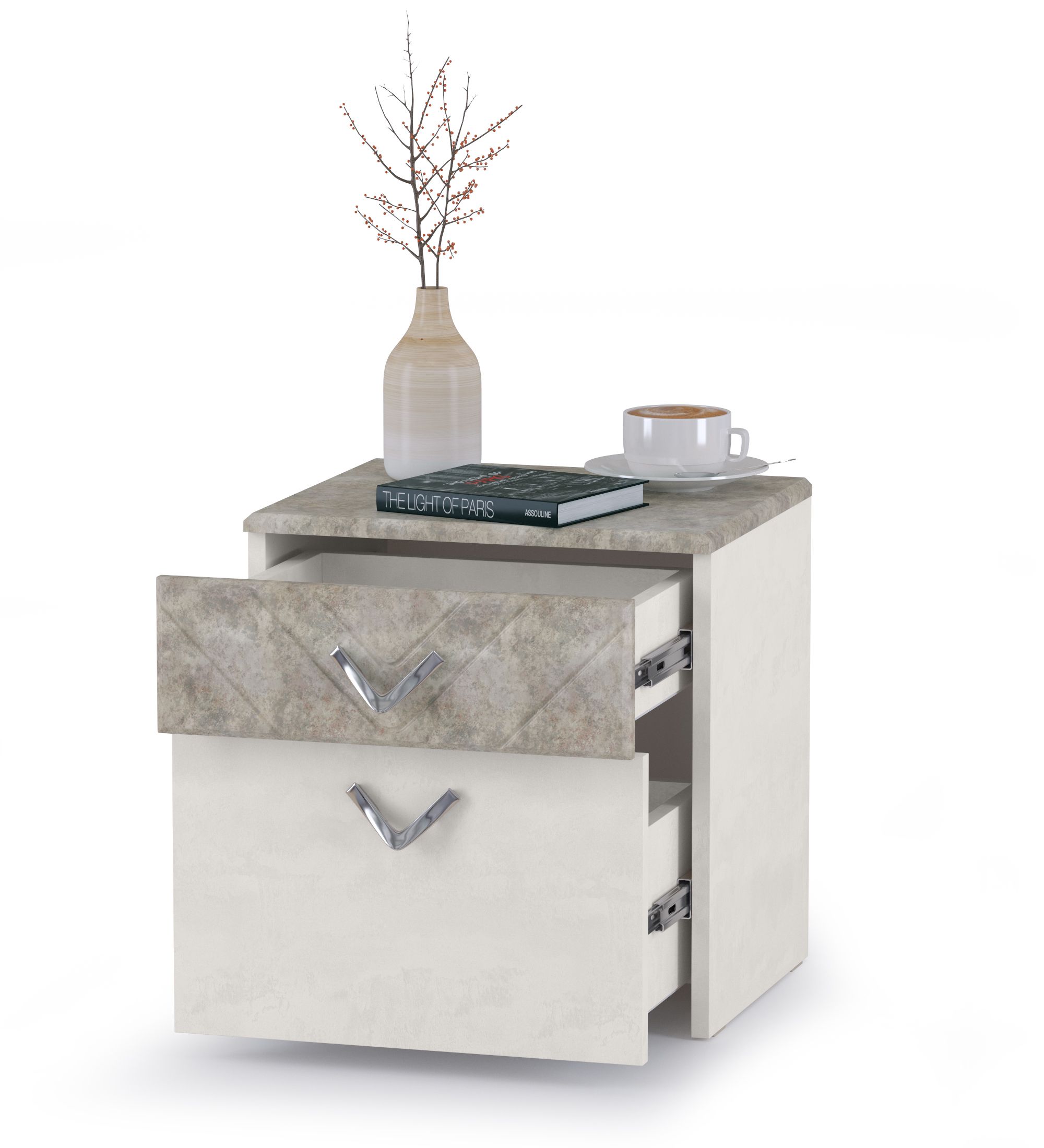 Тумба прикроватная Амели 13.78 шёлковый камень/бетон чикаго беж - практичный элемент зоны отдыха. Стильная тумба Амели с двумя удобными выдвижными ящиками на маленьком «пяточке» сконцентрирует все атрибуты вечернего досуга. Тумба прикроватная Амели 13.78 - элемент из набора мебели для спальни Амели Моби.
