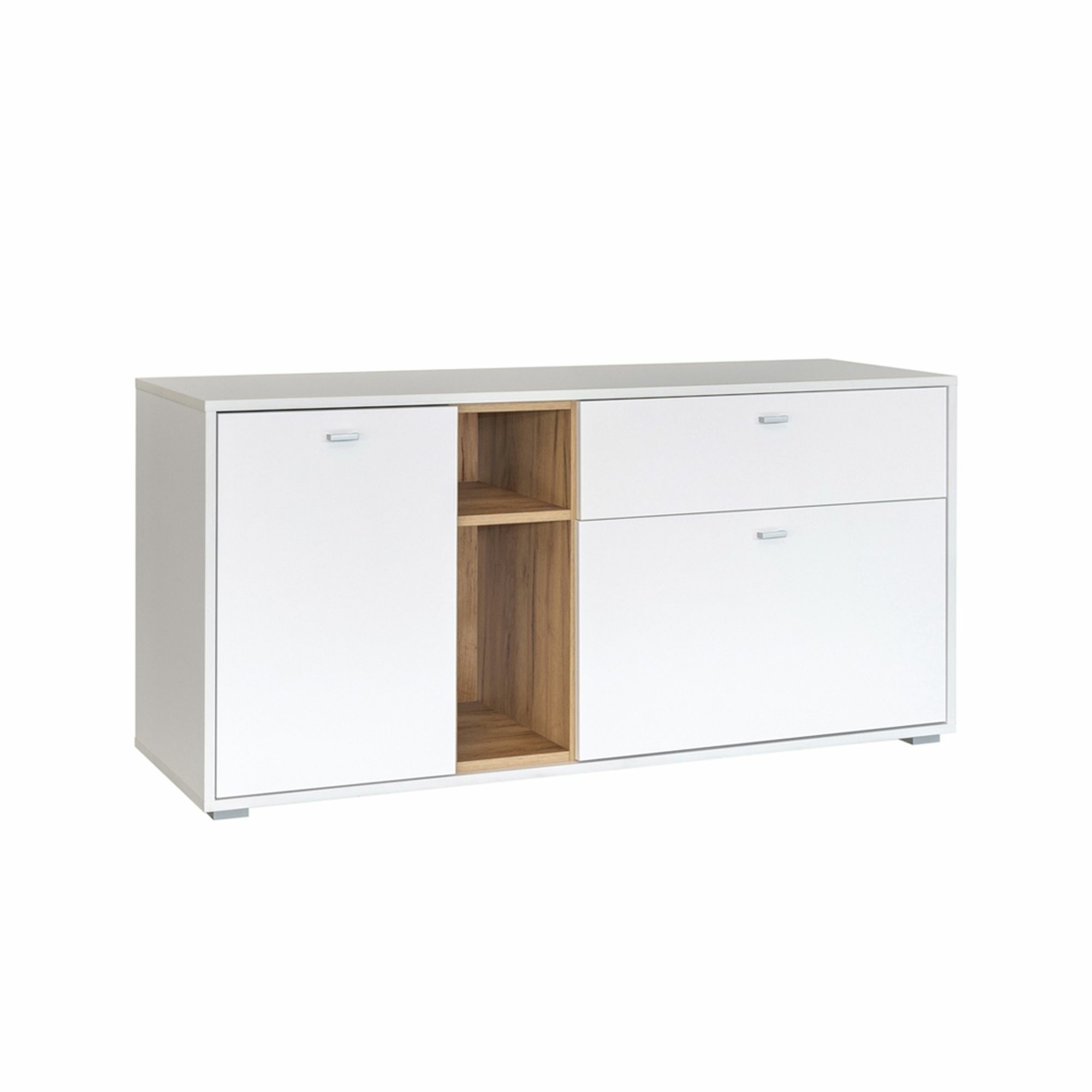 Тумба под ТВ выдержанная в традициях стиля минимализм, сочетание модного белого цвета с теплым древесным оттенком