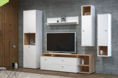Оригинальная конструкция представляет собой группу открытых ниш и короб с двумя выдвижными ящиками.