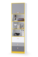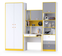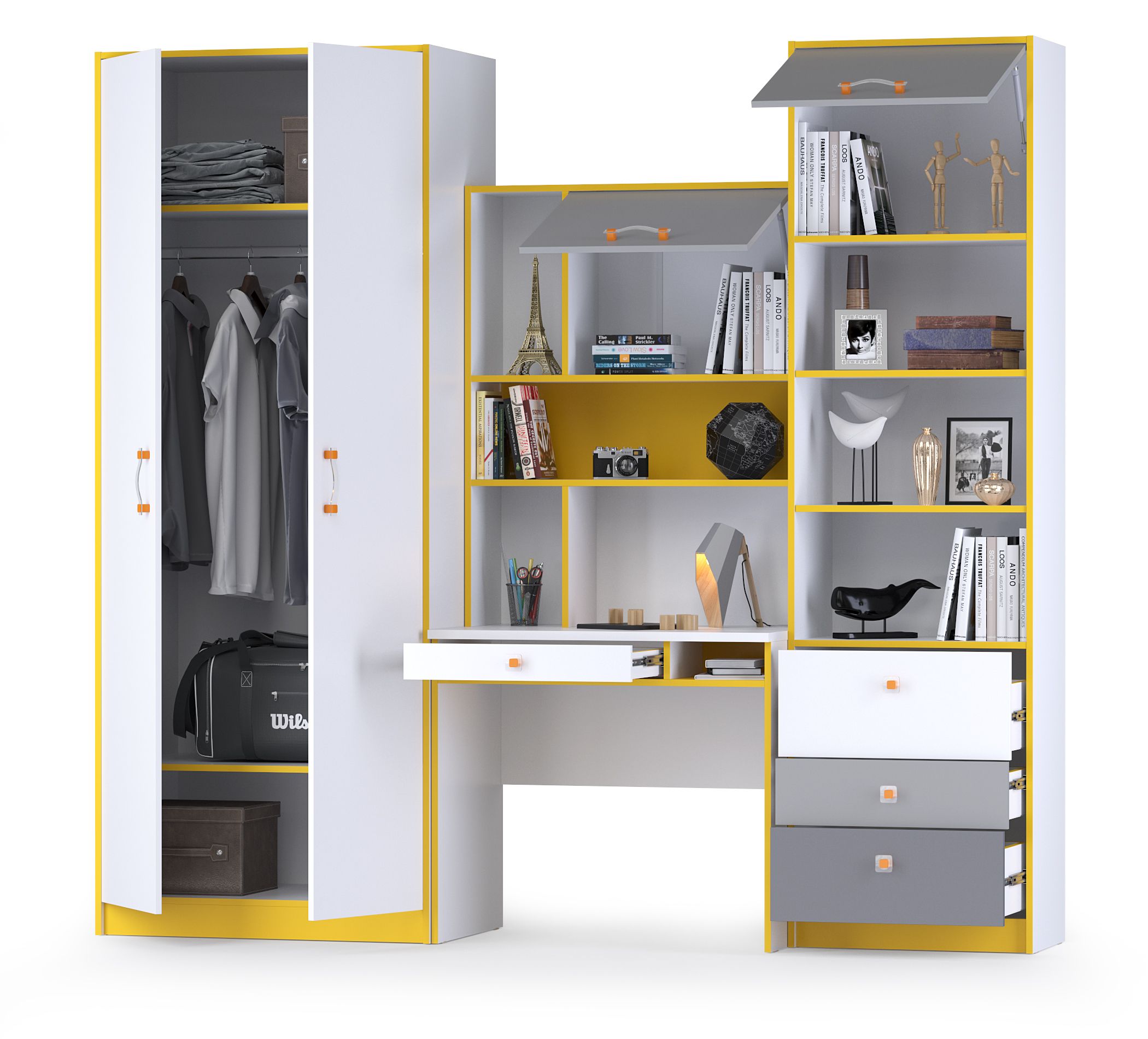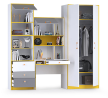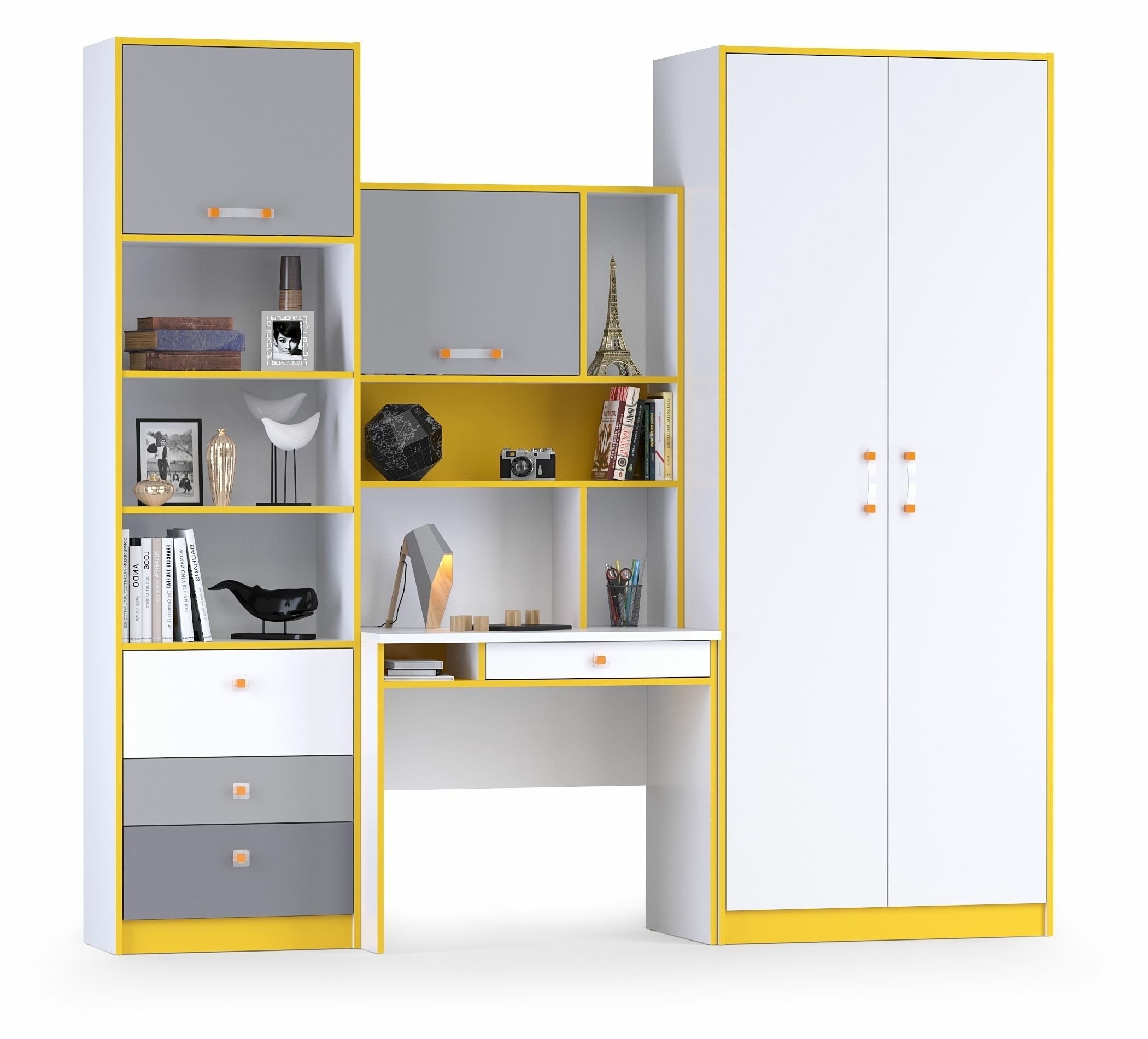 Живописная мебельная стенка № 20 Альфа удобно обустроит владения Ваших деток, с уголком для учёбы и практичной системой хранения. Интерьер детской с мебелью Альфа будет лёгким и ненавязчивым, всё пространство которого пропитано светом, воздухом и свободой. В данной комплектации детская стенка № 20 состоит из письменного стола с надстройкой и двух стеллажей высоких. Удобный, компактный, устойчивый письменный стол Альфа 12.41 - идеальный вариант для детской комнаты и малышей, и студентов. Вместительная столешница с отверстием для электропроводки, под ней выдвижной ящик и ниша - есть всё для плодотворной работы. Надстройка для письменного стола 13.165 с ярким «окошком» центральной ниши и цветной облицовкой торцов очень удобна и эффектна. Высокая надстройка с пятью нишами, одна закрыта откидным фасадом на газовом лифт - возможность хранения учебников «под рукой». Визуально лёгкая надстройка с интересным дизайном разгружает детскую стенку Альфа, добавляет позитива, декоративности и красок. Стеллаж высокий Альфа 09.137 удобно комбинирует все элементы системы хранения - закрытые и открытые отделения, выдвижные ящики. Верхнее отделение с откидным фасадом на газовом лифте, три ниши и три ящика стеллажа - сконцентрируют всё необходимое в одном месте. Систему хранения детской дополняет шкаф 2-х дверный Альфа 13.42 - удобный гардероб, компактный и вместительный одновременно. Распашной шкаф для одежды Альфа 13.42 оборудован горизонтальной штангой для вешалок, и двумя полками, в верхней и нижней части шкафа. Модульная система и позитив сочного цветового сопровождения - удачная возможность создать Мир счастливого детства. Универсальная сборка детской стенки Альфа № 20 расширит круг возможных мебельных комбинаций. Дизайнерская находка мебели Альфа - удивительный колористический баланс строгого монохрома со всплесками ярких красок. Декоративное украшение мебельной стенки - цветная геометрией облицовки торцов и цоколей мебели, стильный акцент лицевой фурнитуры. Эксклюзивные ручки выполнены из прозрачного пластика, цветное основание с покрытием софт-тач, с бархатистым тактильным эффектом.