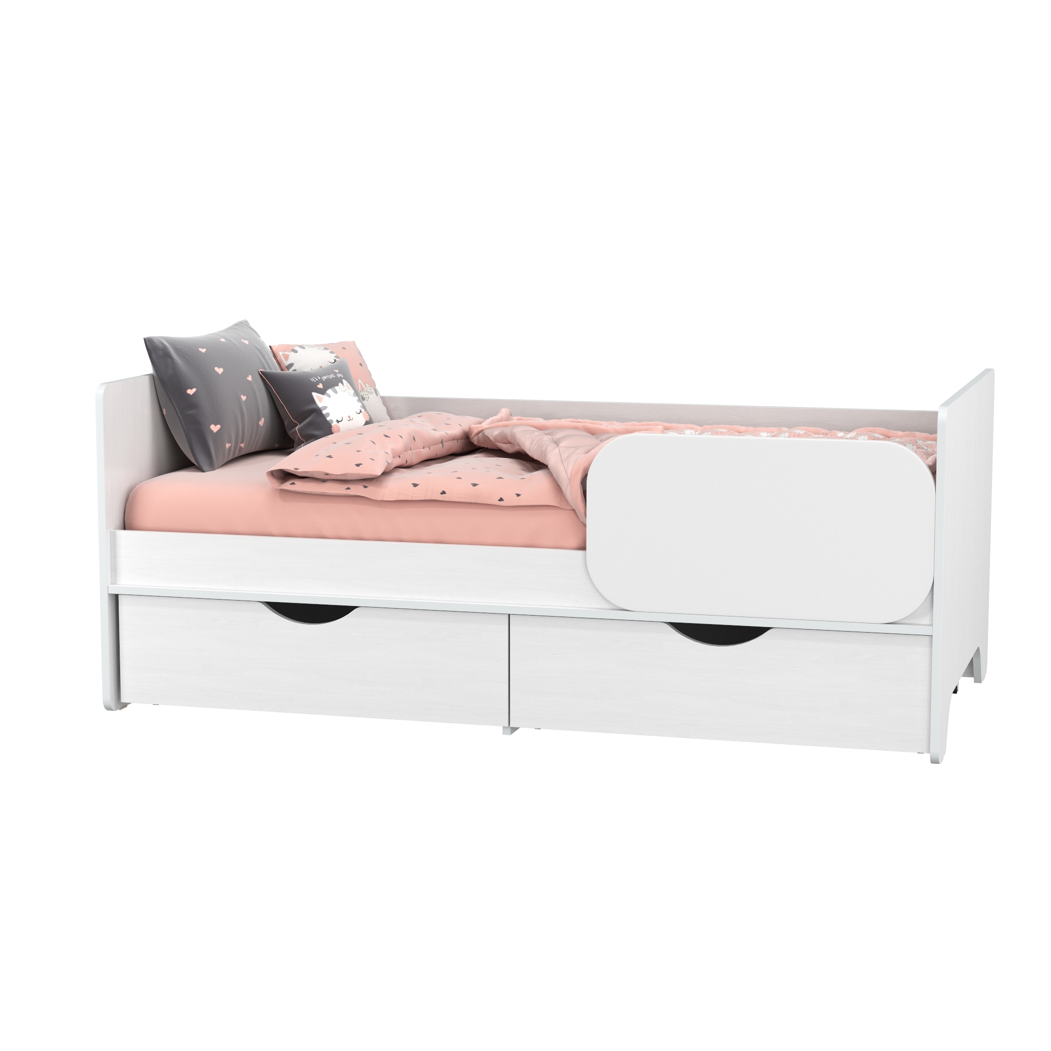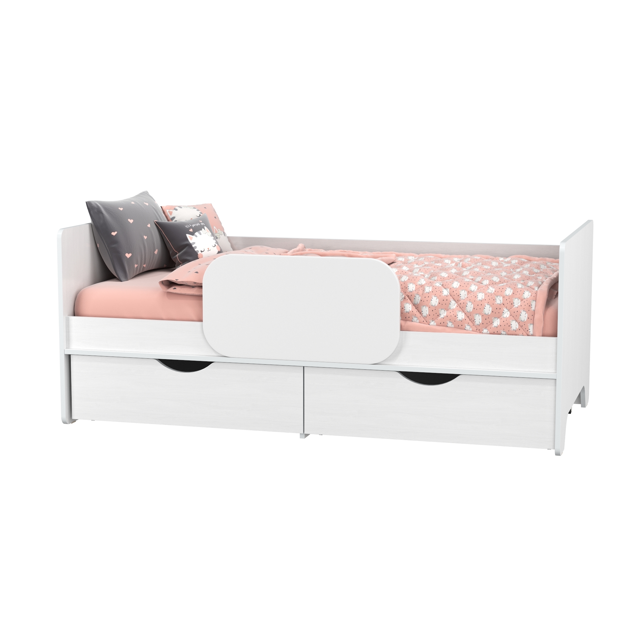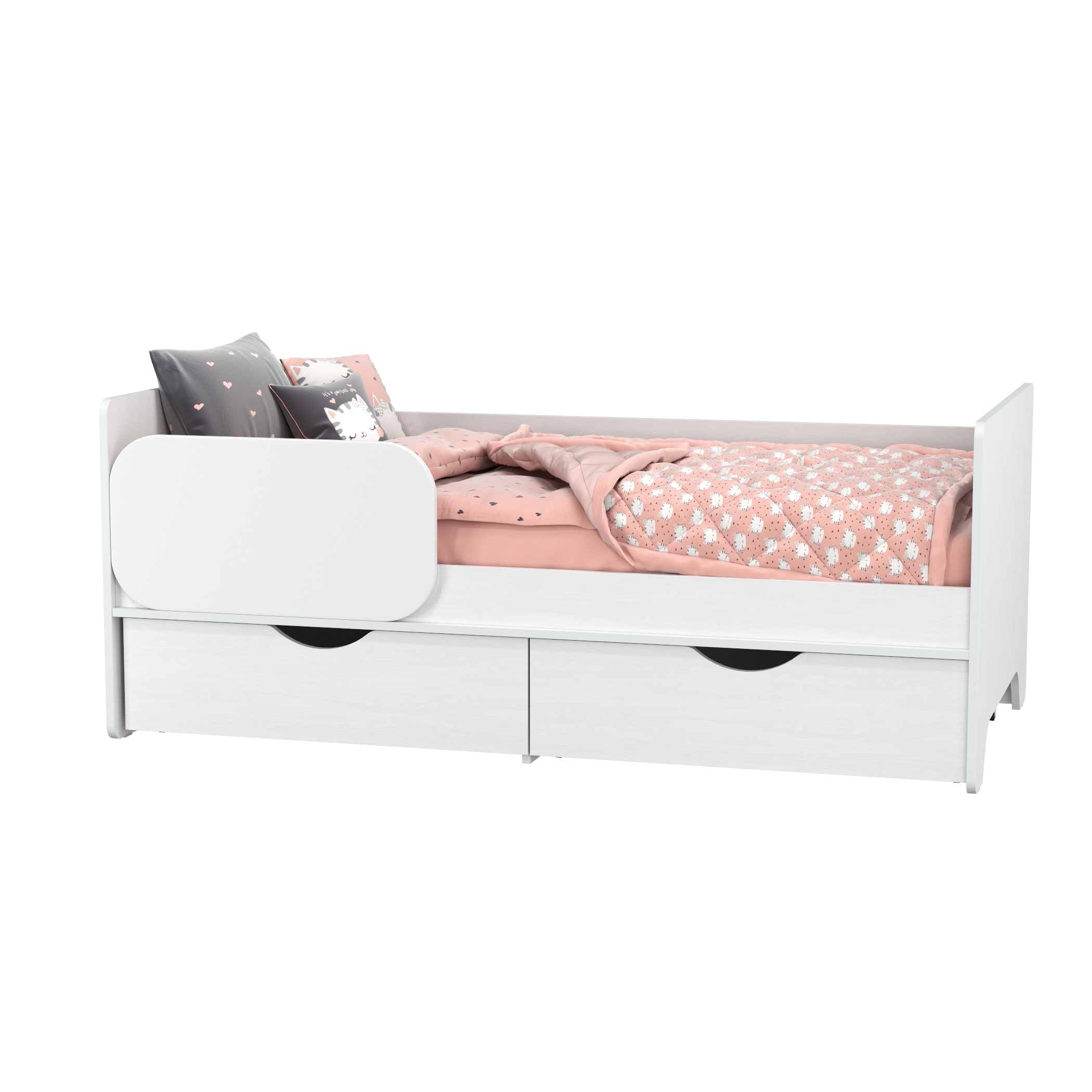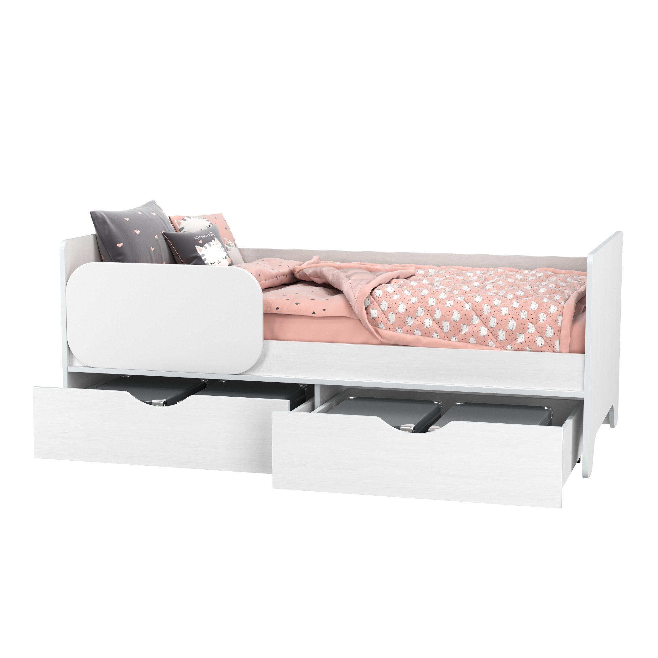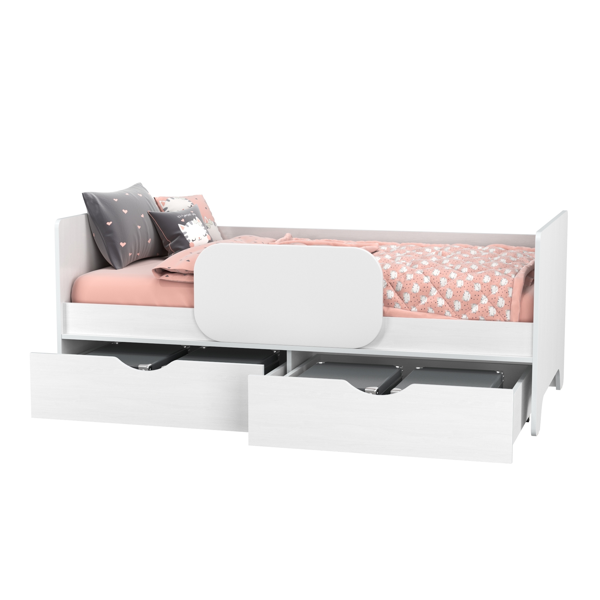 Трогательная прелесть белого цвета кровати с ящиками Уна 11.22 добавит эстетику чистоты и невинности в интерьерный дизайн детской. Все краевые элементы кровати выполнены с травмобезоопасным закруглением, ящики открываются за специальный вырез на фасадах. Выполнена в белом цвете с тиснением, структурой «Поры дерева». Выполнена из высококачественной ламинированной ДСП толщиной 16 мм, торцы окромлены ПХВ плёнкой. Поставляется в разобранном виде.
