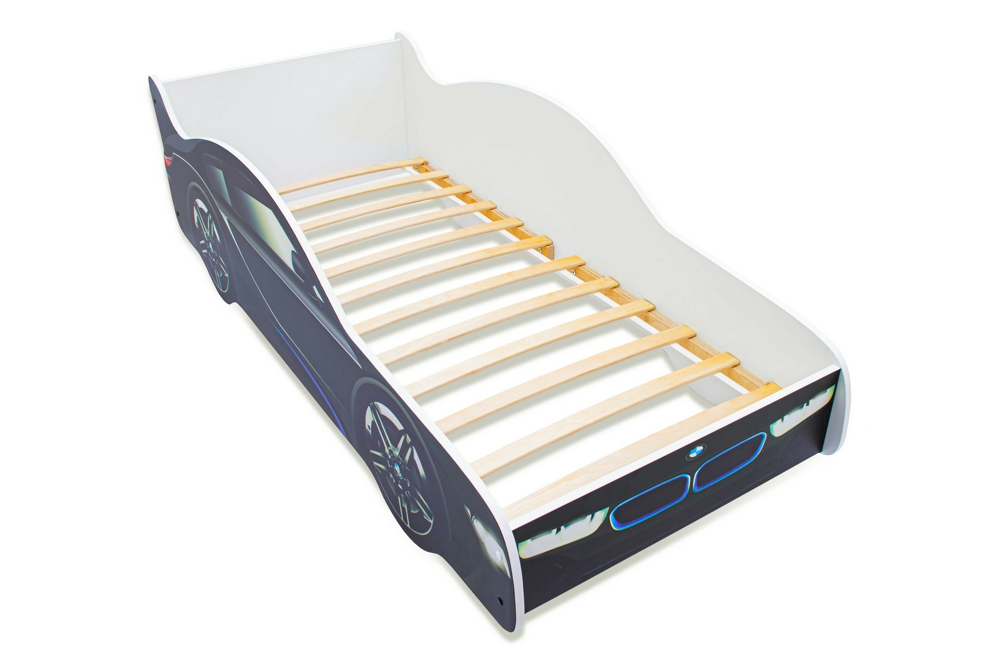 Стильная кровать-машина “БМВ” для детей от 2 до 10-12 лет отлично подойдёт для мальчиков .Кровать изготовлена из экологичного и простого в уходе ЛДСП класса эмиссии Е1, который соответствует стандартам качества в области экологии и охраны здоровья. Имеет прочное ортопедическое основание из 12 лат и выдерживает нагрузку до 200 кг. Все углы закруглены, все края покрыты кромкой ПВХ 1 мм и безопасны для малышей, что обеспечивает безопасность ребёнка во время игры. Удобные бортики позволяют не упасть во сне.Рисунок нанесён безопасной и стойкой ультрафиолетовой краской. Размер кровати:170х73х50 (ДхШхВ) см.Размер спального места:160х70 (ДхШ) см