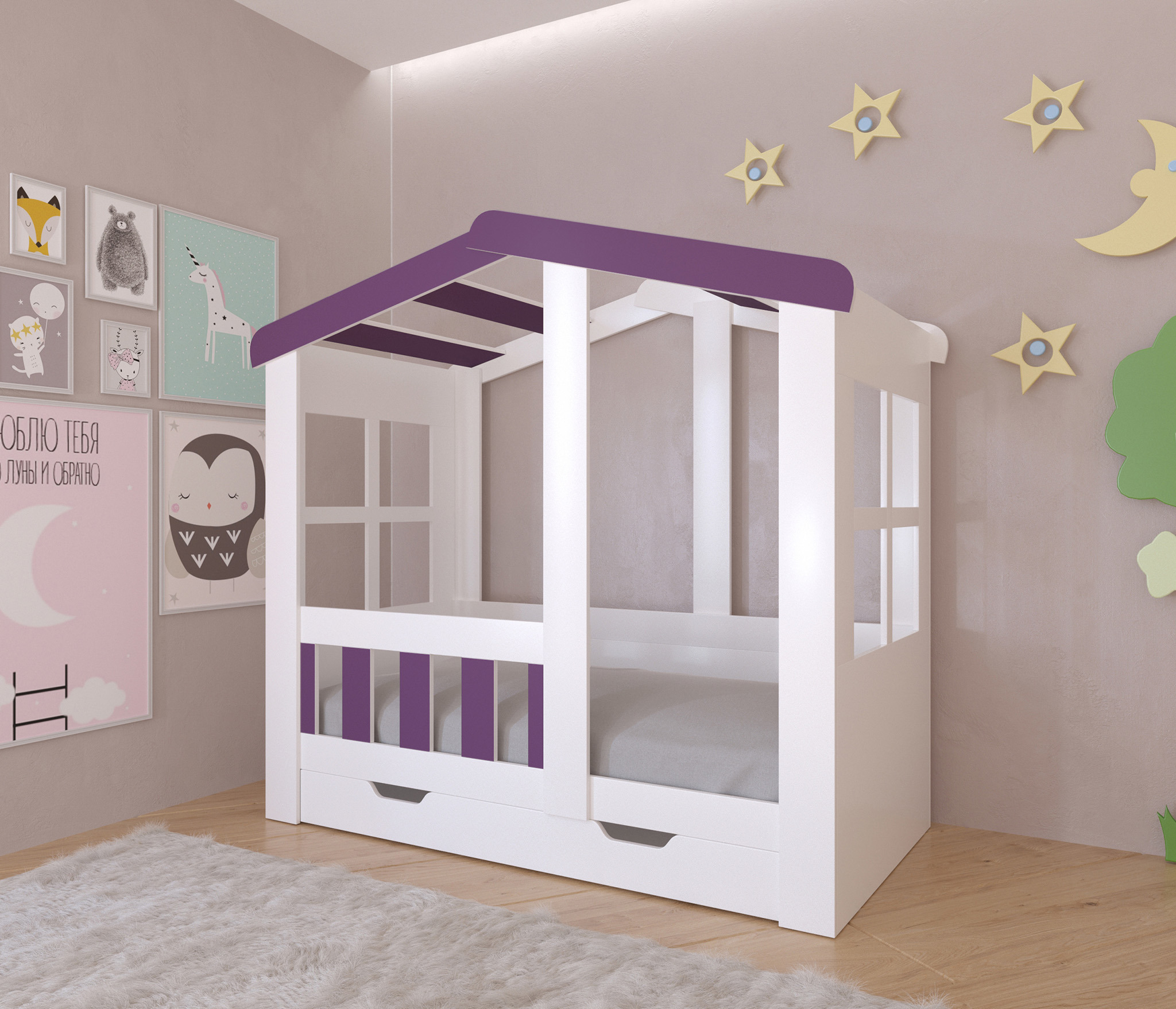 Кровать-чердак Астра домик с ящиком (Фиолетовый)